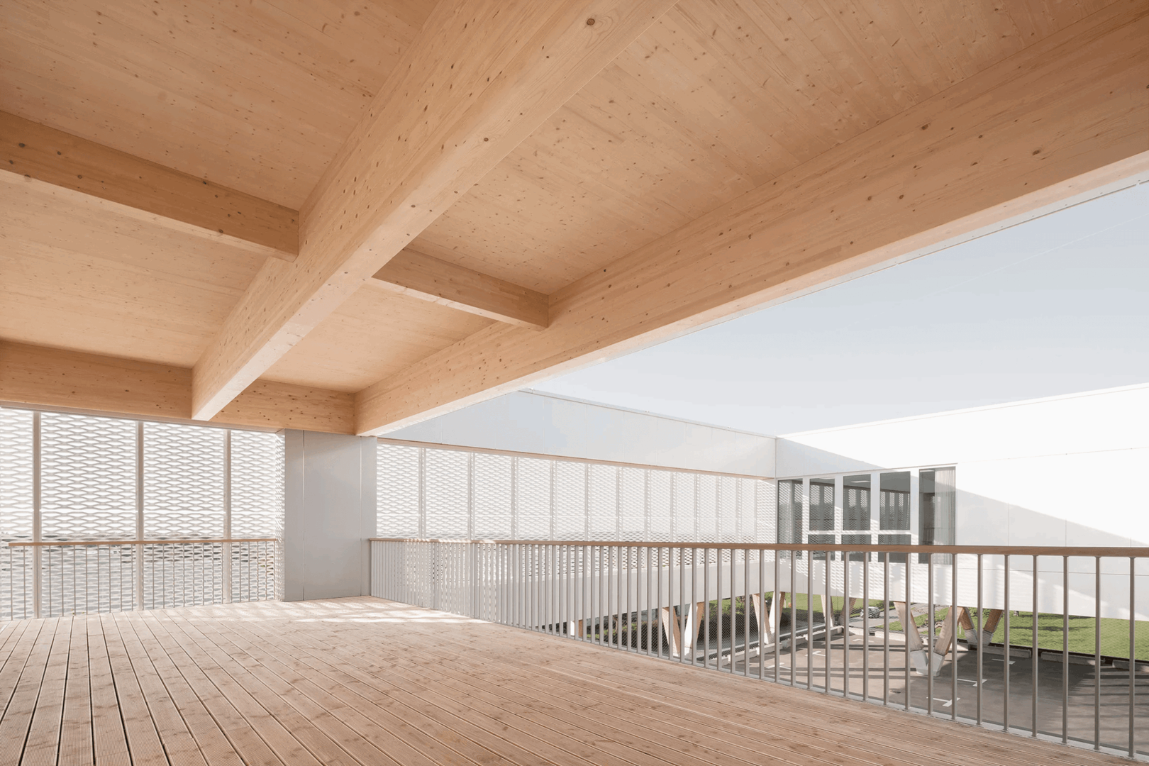 Un escalier mène au niveau supérieur à ossature en bois, qui abrite des espaces partagés, des salles de classe et des bureaux et est enveloppé d'un bardage de panneaux métalliques blancs perforés. Au centre de ce niveau supérieur se trouve un vide, permettant de surplomber les espaces inférieurs par des fenêtres et depuis un espace terrasse extérieur.