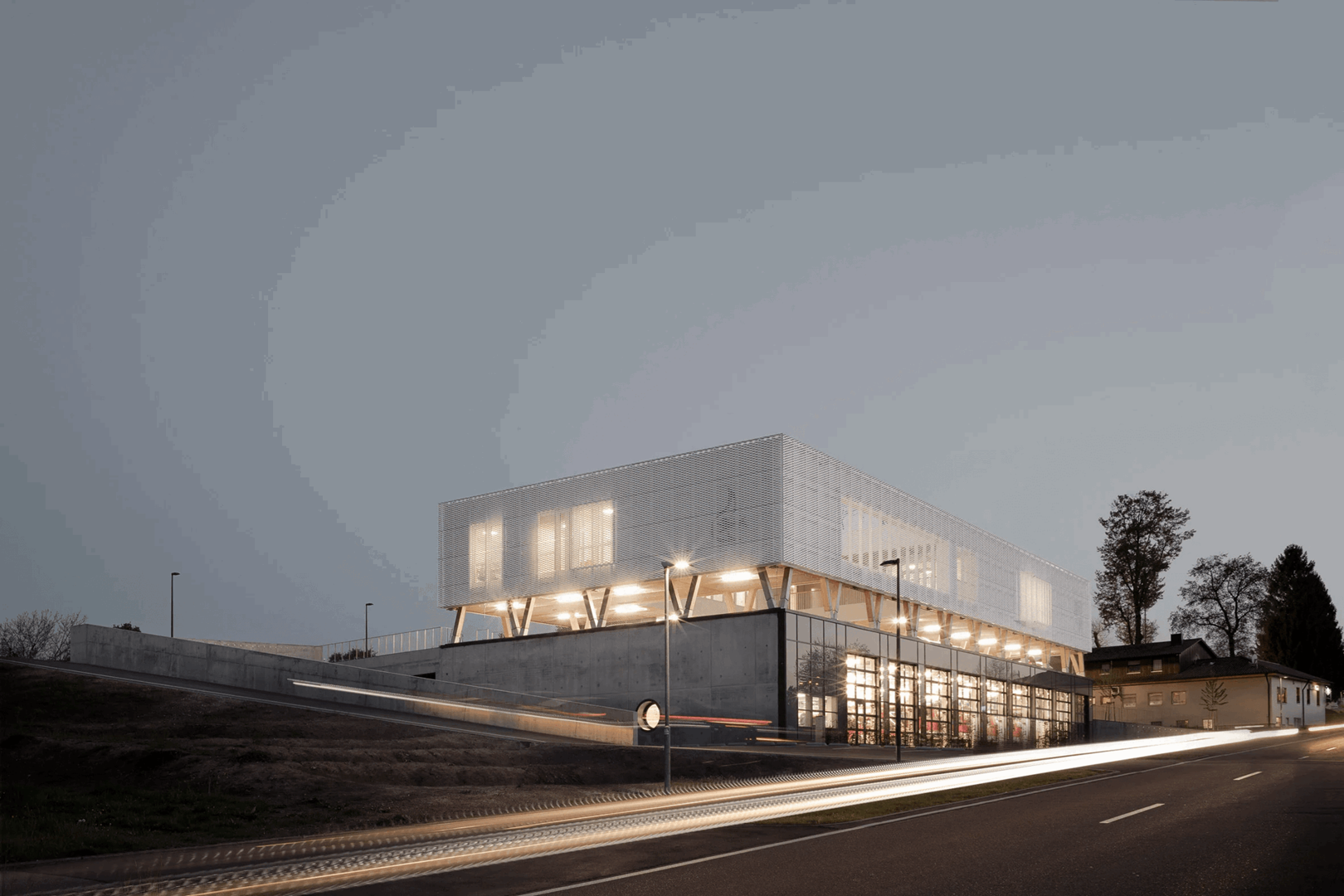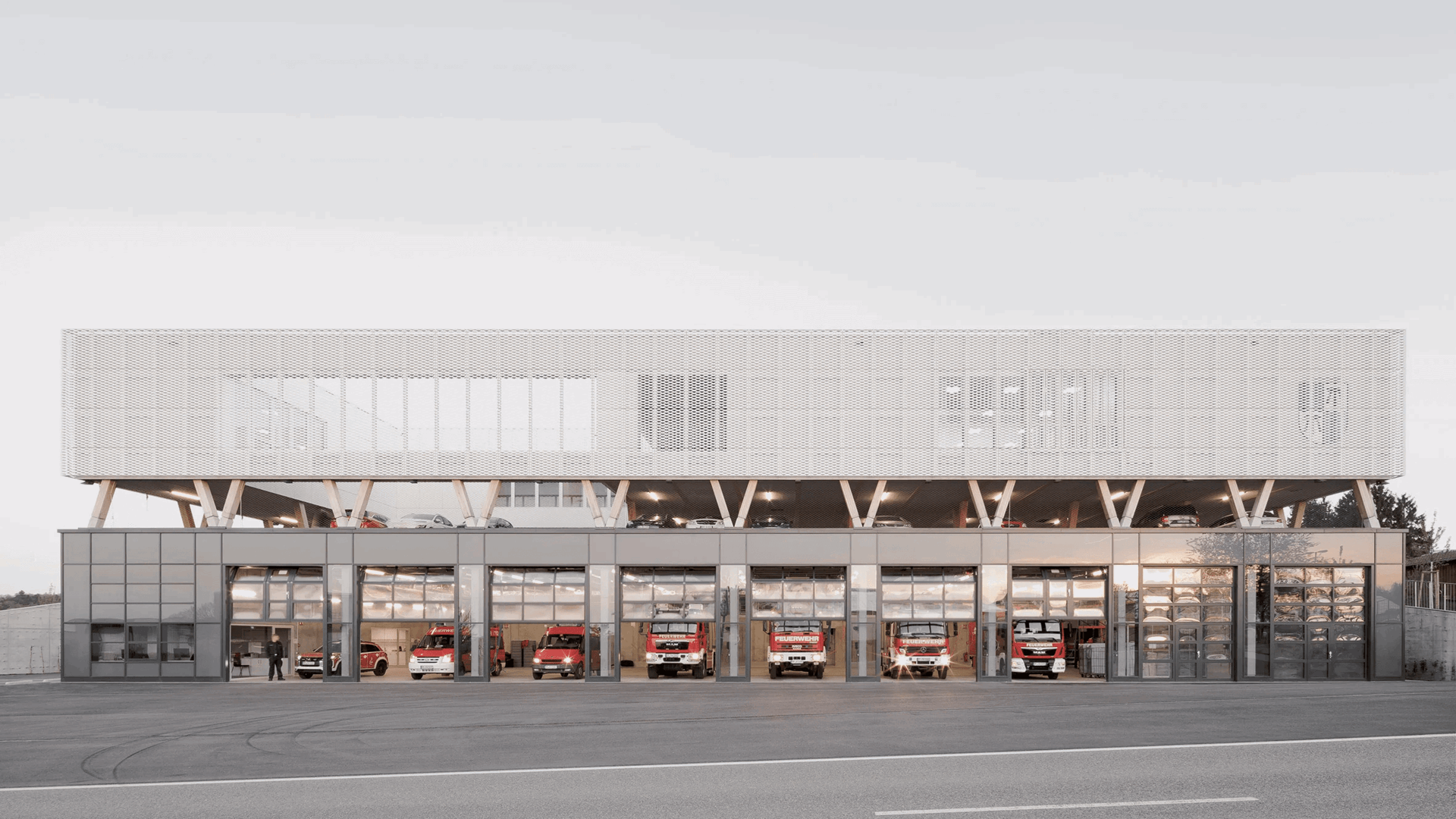 Le design unique de la nouvelle caserne de pompiers de Straubenhardt, en Allemagne, se démarque par l’étage supérieur, ultra-léger, revêtu de métal perforé et élevé sur des poutres en bois au-dessus d'un socle en béton. La conception est à mettre à l’actif du bureau d’architecture local Wulf Architekten.