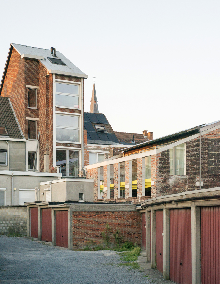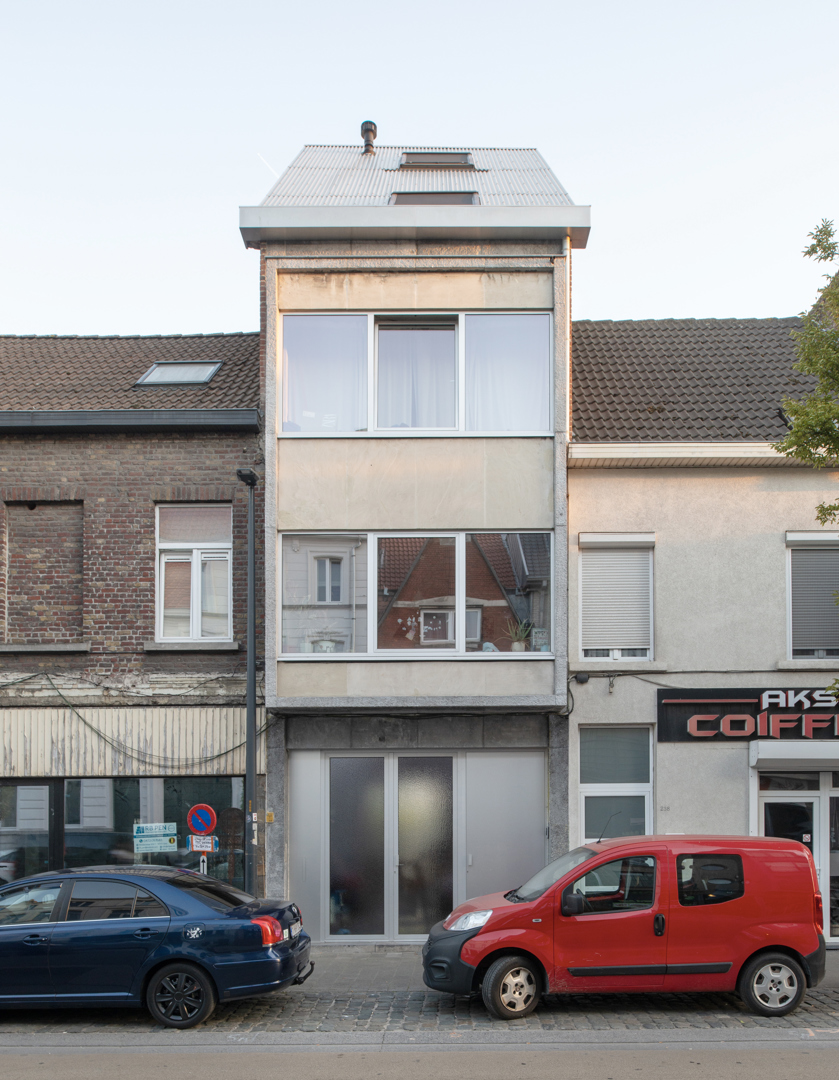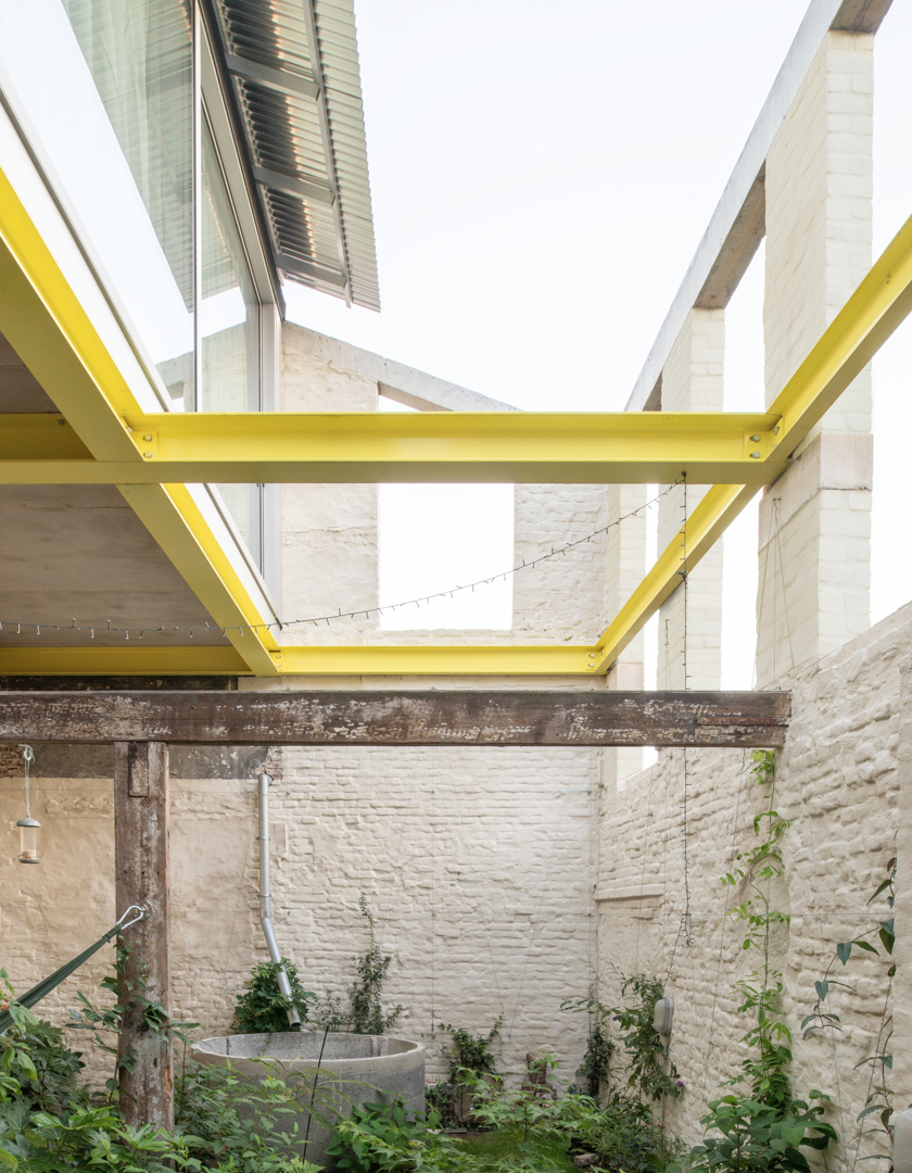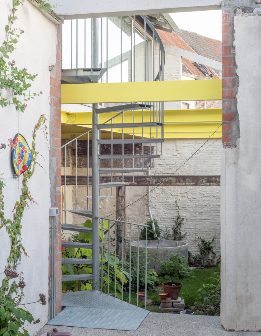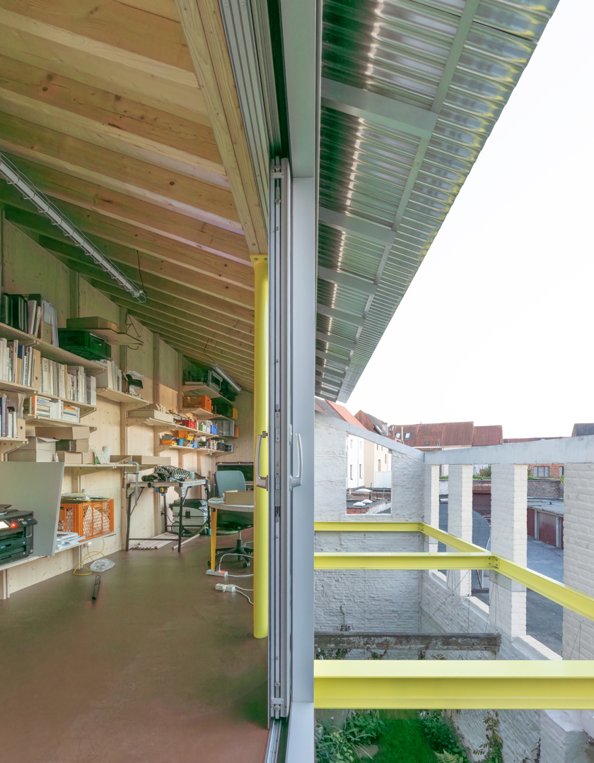 Une maison mitoyenne étroite sur un terrain profond en ville est dénudée et réaménagée en logement avec atelier. Chaque intervention reste lisible. Le squelette en béton est préservé et modifié chirurgicalement avec de la maçonnerie, des poutres en bois, des colonnes en acier et des cloisons intérieures en contreplaqué. Le nouveau hall d'escalier est libéré par une sculpture en béton de l'artiste Bram Vanderbeke. À l'arrière, la grange en briques est transformée en atelier. Le toit à double pente est coupé en biais, les façades renforcées avec une construction en acier jaune qui fait référence à des étayages temporaires. Entre les pignons, un volume en bois est tendu suivant la ligne du toit incliné et équipé d'un auvent. L'atelier donne sur le jardin intérieur. En dessous, un espace extérieur couvert se crée, relié à un jardin clos.