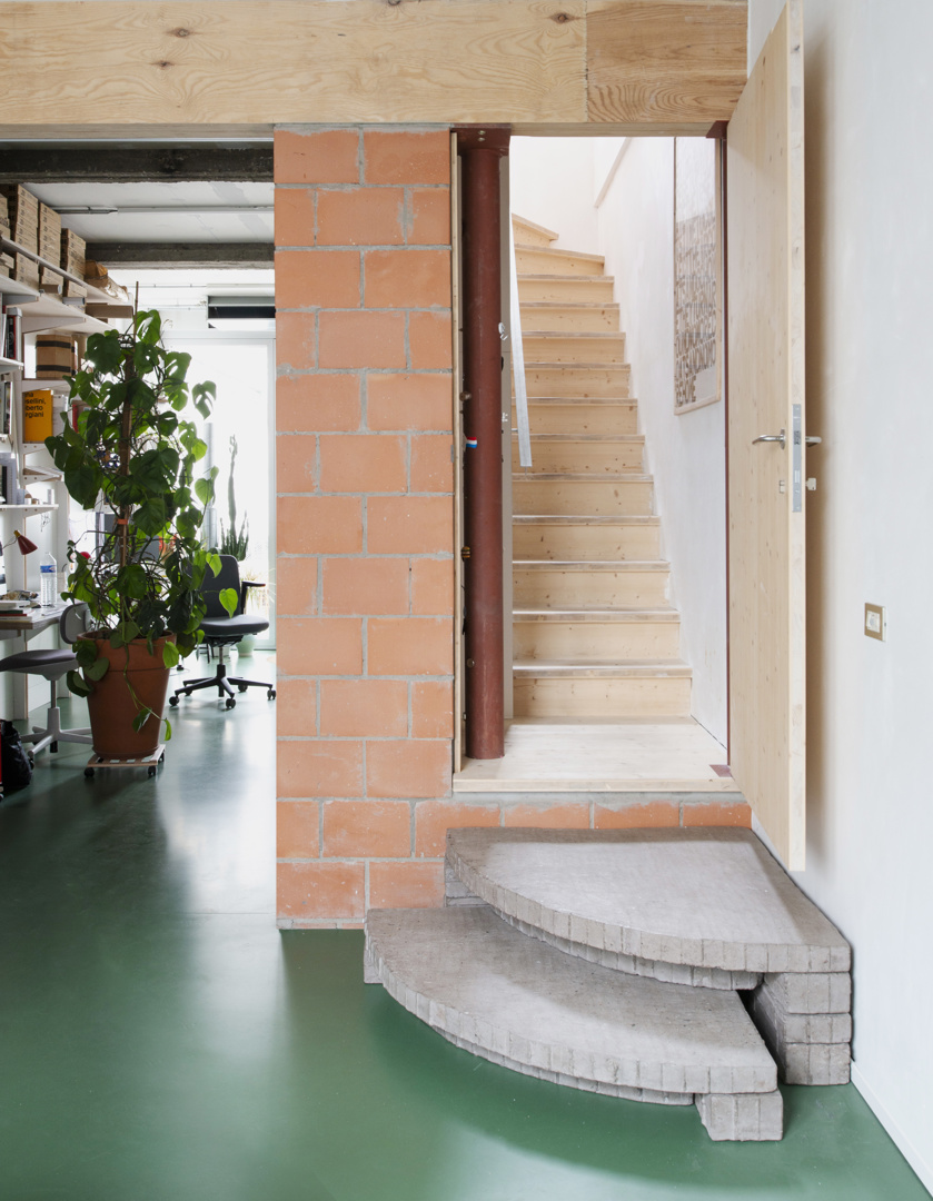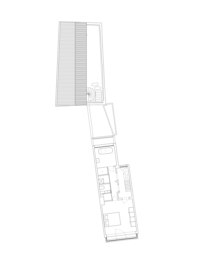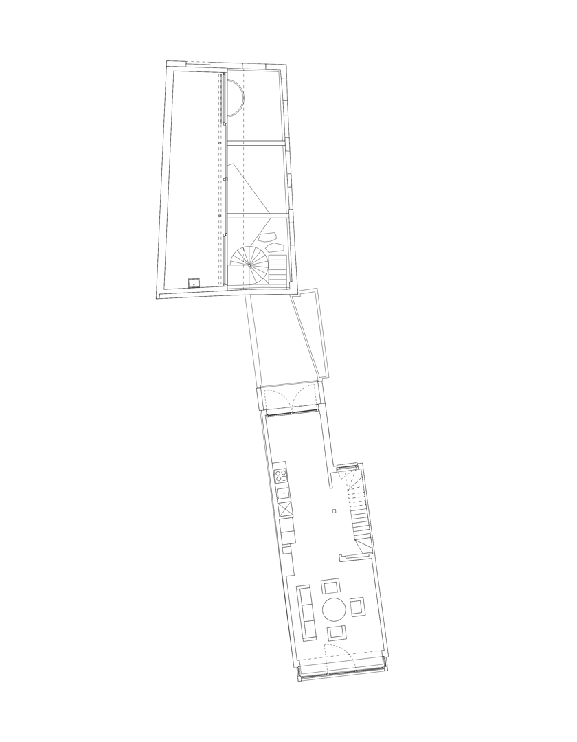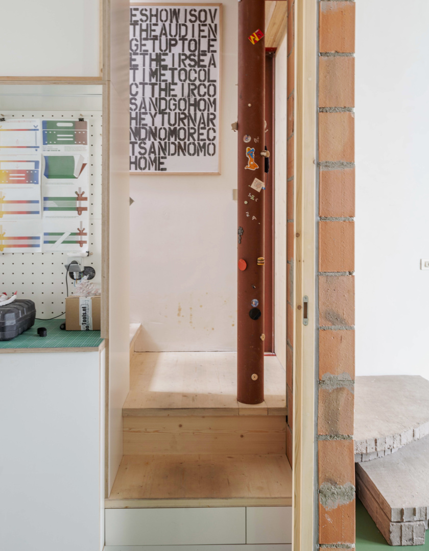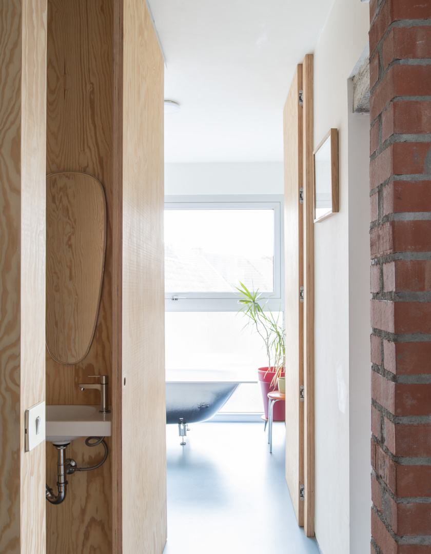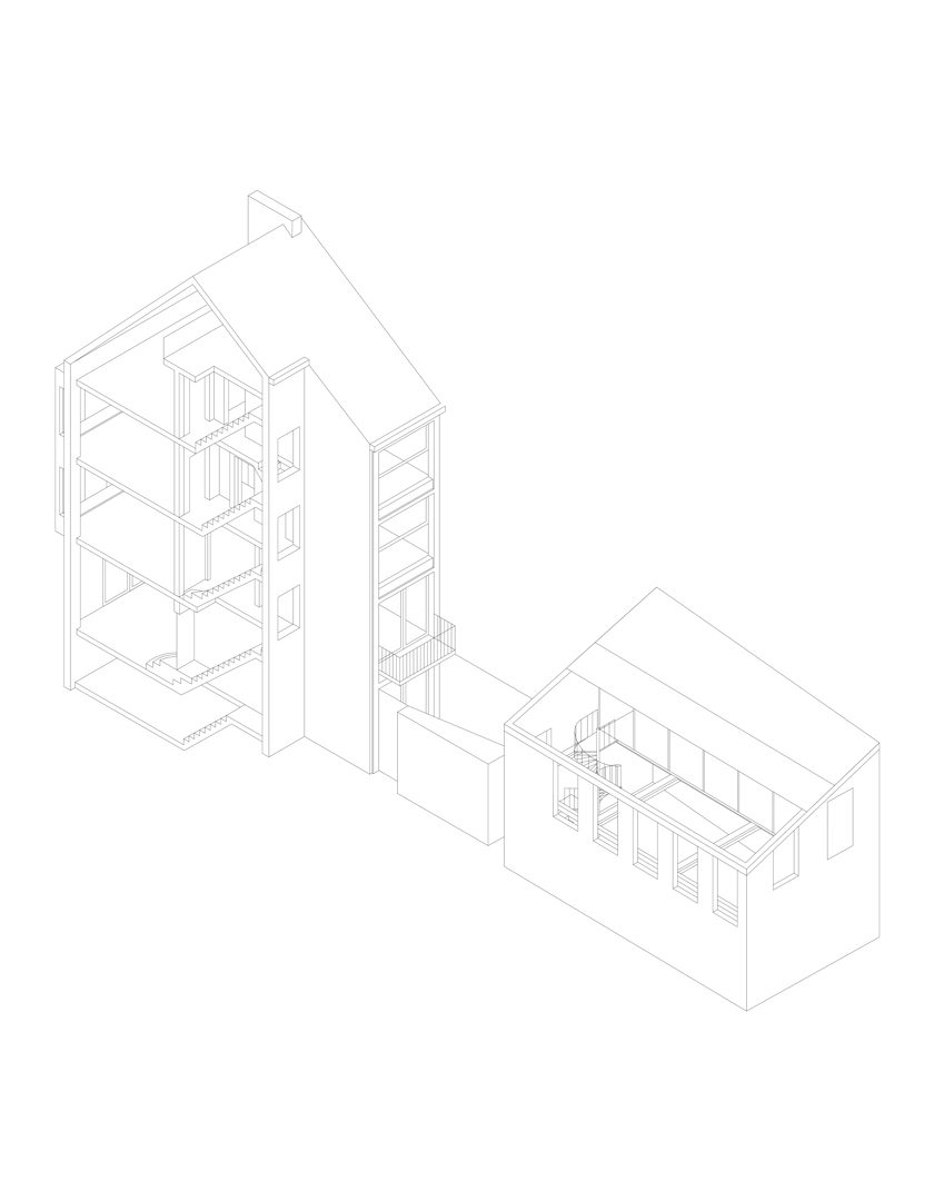Une maison mitoyenne étroite sur un terrain profond en ville est dénudée et réaménagée en logement avec atelier. Chaque intervention reste lisible. Le squelette en béton est préservé et modifié chirurgicalement avec de la maçonnerie, des poutres en bois, des colonnes en acier et des cloisons intérieures en contreplaqué. Le nouveau hall d'escalier est libéré par une sculpture en béton de l'artiste Bram Vanderbeke. À l'arrière, la grange en briques est transformée en atelier. Le toit à double pente est coupé en biais, les façades renforcées avec une construction en acier jaune qui fait référence à des étayages temporaires. Entre les pignons, un volume en bois est tendu suivant la ligne du toit incliné et équipé d'un auvent. L'atelier donne sur le jardin intérieur. En dessous, un espace extérieur couvert se crée, relié à un jardin clos.