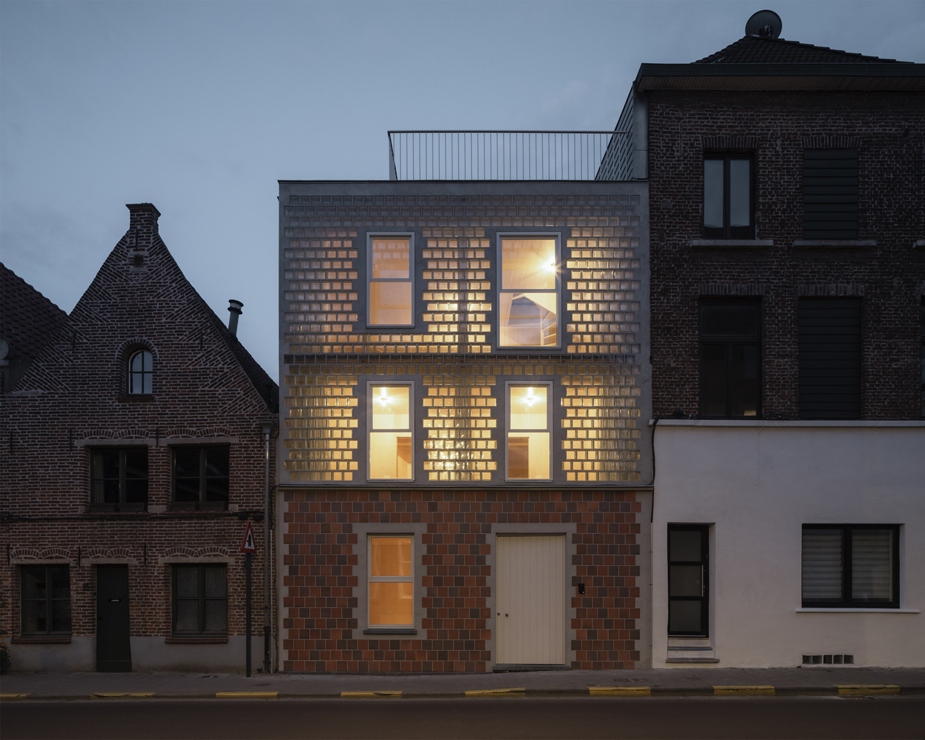 L'approche en couches crée un jeu riche entre l'intérieur et l'extérieur, entre l'intimité et l'ouverture. Le terrain entièrement enclavé est utilisé efficacement grâce à une construction en bois massif avancée, une double façade et une disposition réfléchie. La façade en carreaux de verre se marie harmonieusement avec des éléments classiques qui renvoient au patrimoine local. Le concept d'habitation renverse la structure traditionnelle : chambres en bas, espaces de vie en haut, couronnés par une terrasse sur le toit. L'intérieur, avec ses murs préfabriqués en bois massif teinté de blanc et ses sols en terre cuite, dégage calme et durabilité. Le projet recherche une relation évidente avec le lieu, non par l'harmonie pure, mais par un équilibre entre harmonie et dissonance. Ainsi, naît un bâtiment qui complète, mais aussi défie l'endroit.