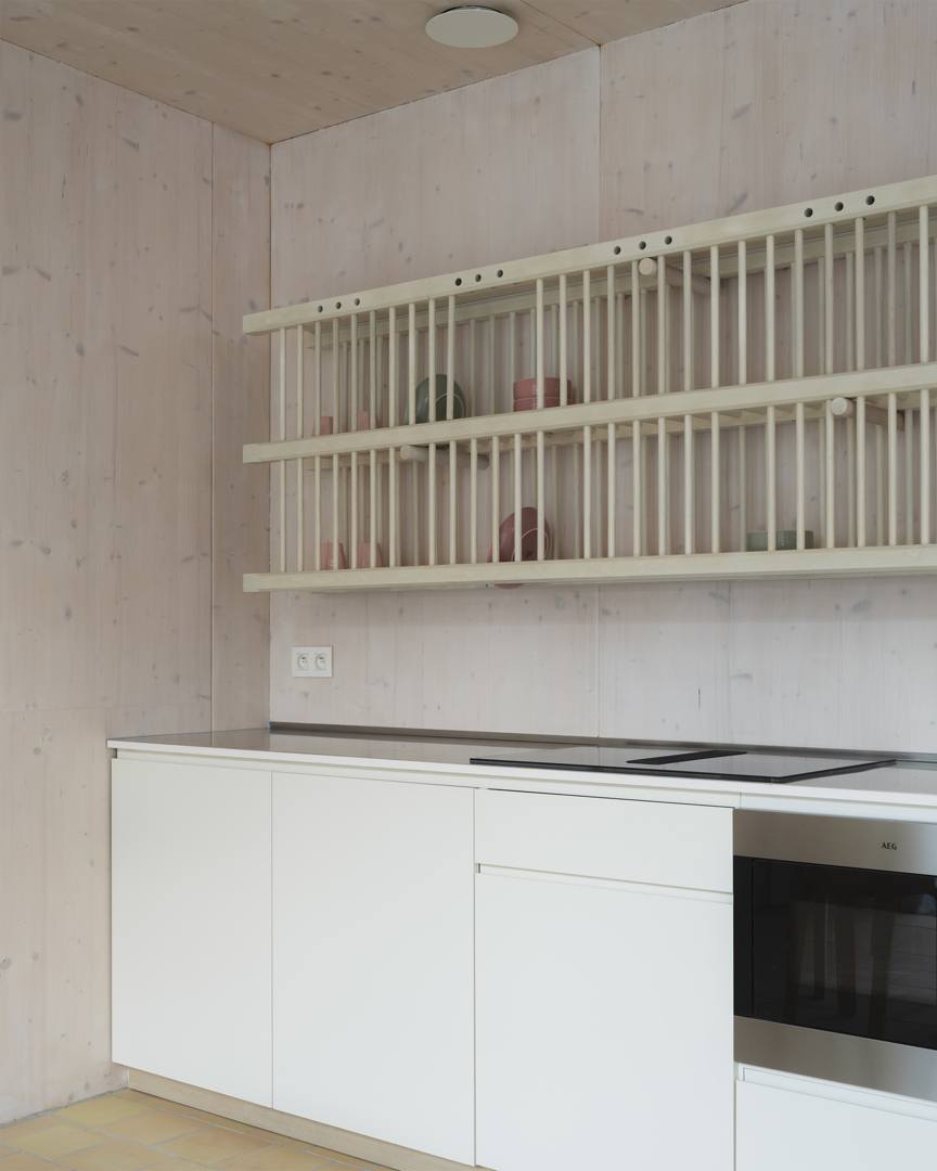 Dans le choix des matériaux, des solutions durables ont été systématiquement privilégiées. La maison est construite en panneaux de bois massif CLT (caractérisés par une technique de collage écologique et non toxique) qui ont été préfabriqués et montés rapidement sur place. À la fin de leur cycle de vie, les bâtiments en CLT peuvent être démontés, ce qui permet de réutiliser ou de recycler les panneaux. La façade est composée de blocs de verre transparents avec une transmission lumineuse de 80% (pour protéger du soleil). Combinés à la façade intérieure bien isolée et à l'air immobile entre les deux péllicules de façade, ils forment un ensemble de haute qualité et efficace. Grâce à la pompe à chaleur, aux panneaux solaires, au système de ventilation équilibrée avec récupération de chaleur et à la forme compacte de construction, la maison est par ailleurs très économe en énergie.