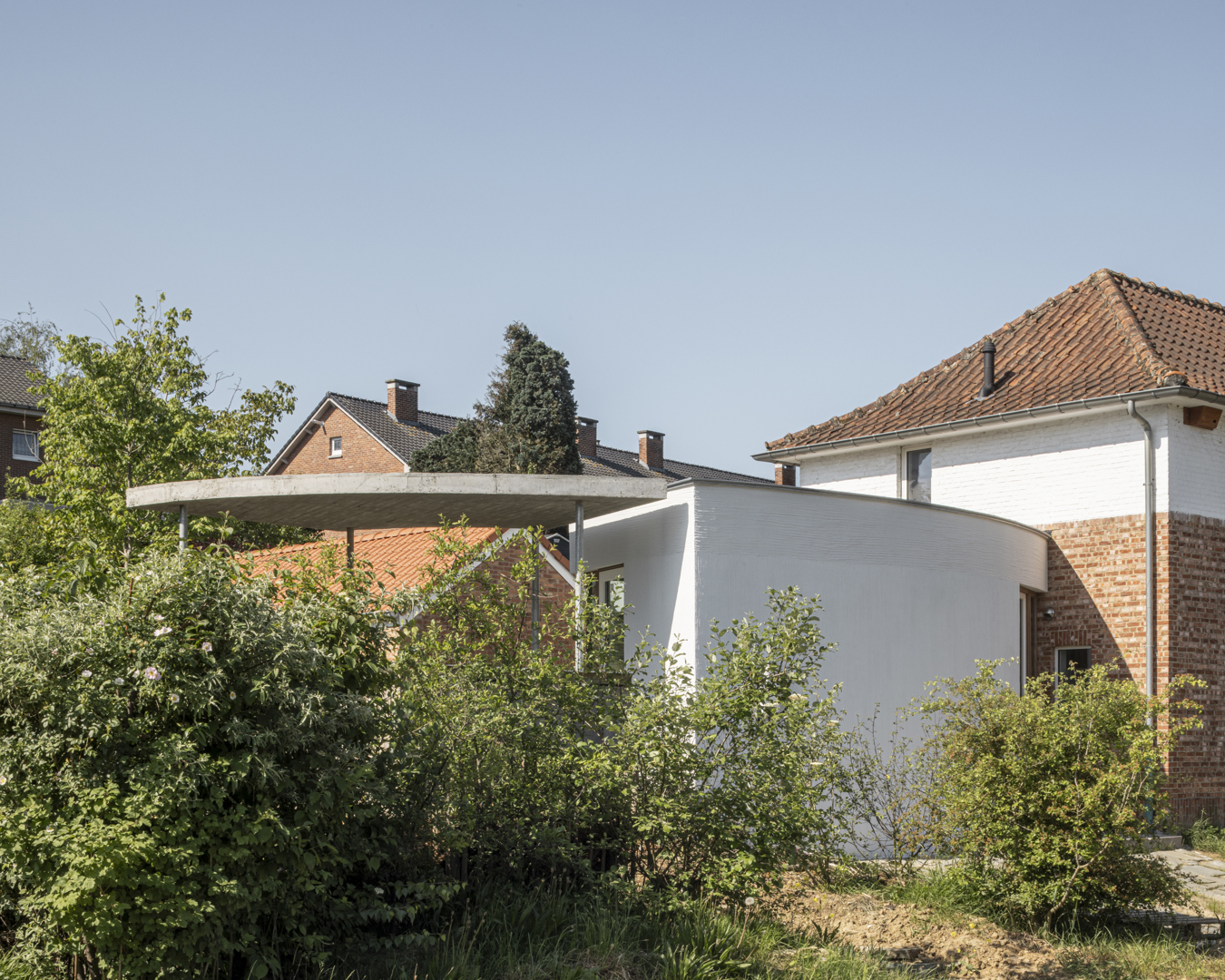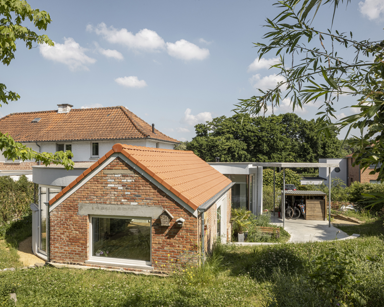 [Cette maison en périphérie du centre-ville de Louvain fait partie d'un ensemble de logements sociaux, repris à l'inventaire comme exemple typique des quartiers populaires d'après-guerre. Le grand terrain compte, outre la maison, plusieurs petits bâtiments qui formaient un ensemble morcelé et bloquaient la relation entre la maison et le jardin. Pour un maître d'ouvrage passionné par le jardinage et la biodiversité, un lien fort avec le jardin était au cœur de la mission. C'est pourquoi une zone elliptique est définie au centre du terrain, reliant tous les bâtiments de manière fluide. Le centre de gravité de l'habitation se déplace ainsi vers le milieu du terrain. Un patio au cœur de l'ellipse garantit que de n'importe où dans la maison, on ait un contact direct avec le jardin.]