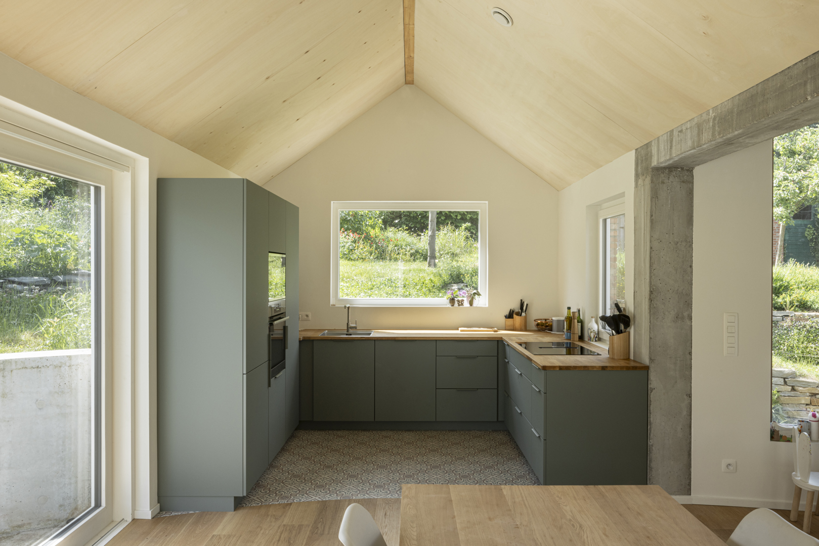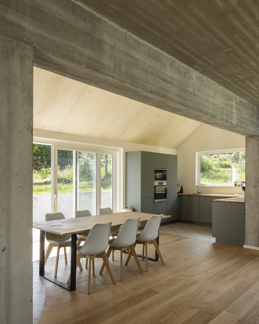 [HEC est durable avant tout par ce qui n'a pas été démoli. Tous les bâtiments existants ont été conservés et réaffectés autant que possible, chacun avec une nouvelle fonction adaptée à leur spécificité, même s'ils semblaient à première vue inutilisables. L'utilisation consciente des matériaux est le fil conducteur du projet : les chambres, qui nécessitent moins de confort que les espaces de vie, ont été moins isolées - un choix réfléchi qui évite le gaspillage. Tout aussi importante que le confort de vie est la biodiversité. Le jardin dispose de tout l'espace : la disposition soigneuse du nouveau volume crée divers espaces extérieurs, chacun avec son propre caractère - ensoleillé ou ombragé, aménagé ou sauvage, actif ou intime. La maison s'intègre dans le jardin, et non l'inverse.]