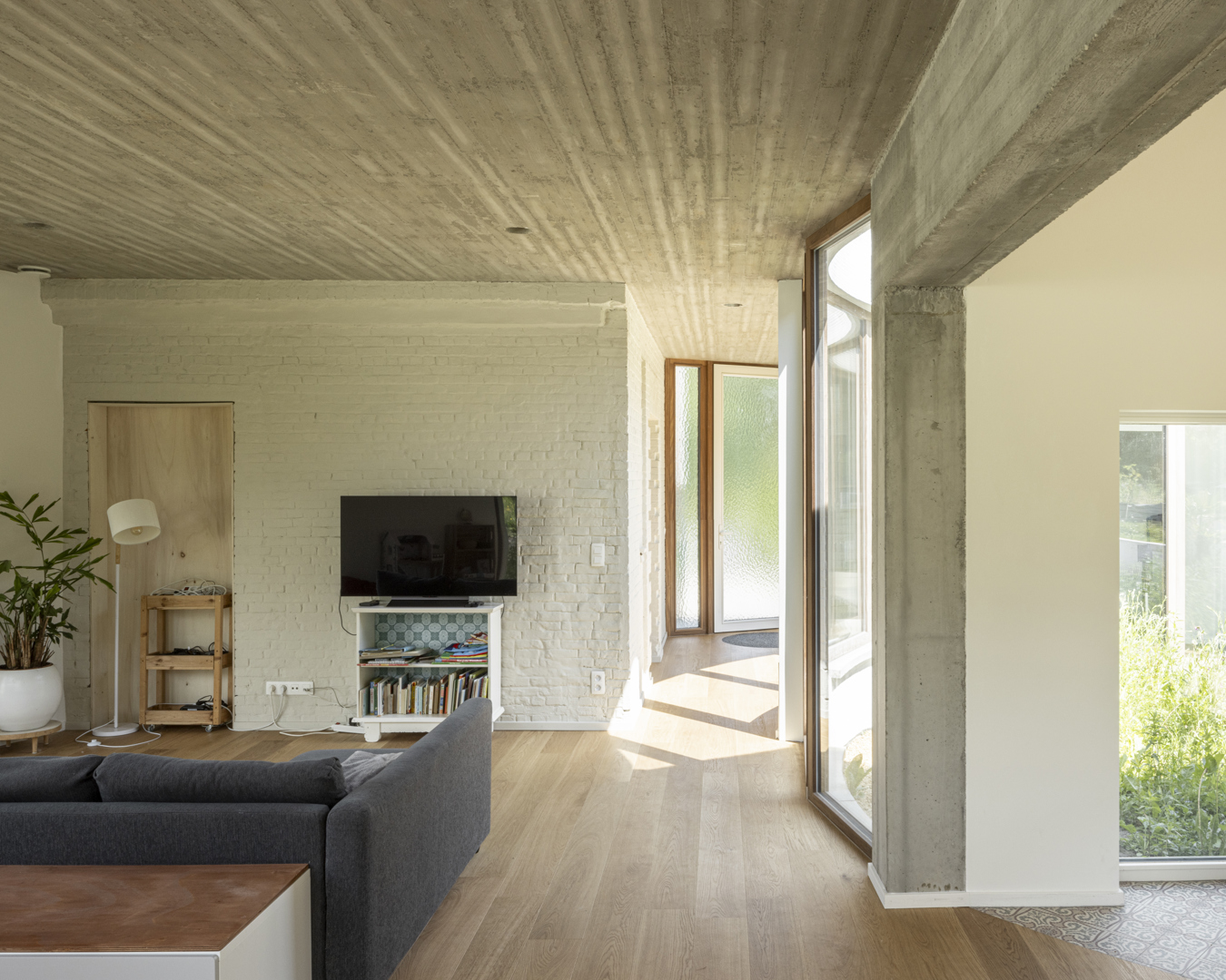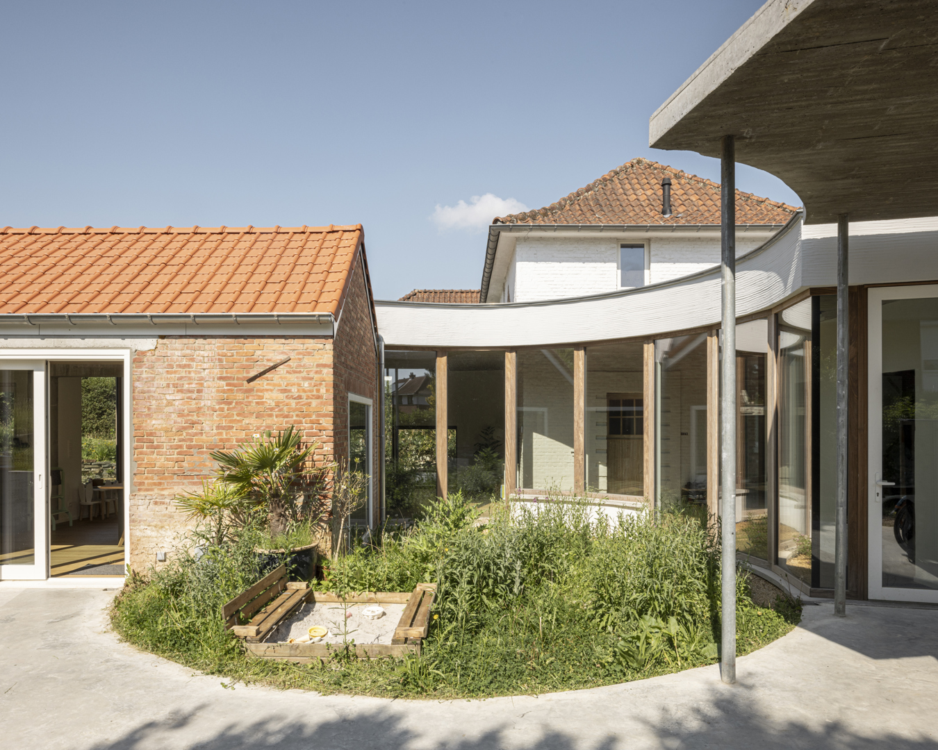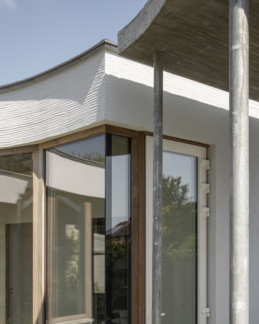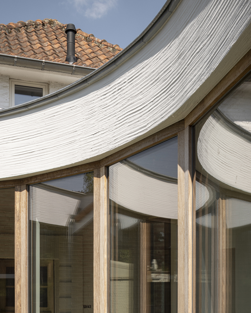 [HEC montre comment transformer une maison vieillissante avec une valeur patrimoniale sans perdre ses qualités architecturales. La division entre maison de jour et de nuit est une solution à la fois élégante et efficace. L'ellipse comme principe d'organisation transforme un ensemble fragmenté en un tout cohérent. La forme atypique n'est pas un caprice mais un choix réfléchi : elle génère des vues omnidirectionnelles sur le jardin, des espaces fluides sans frontières dures et un patio central qui relie tous les espaces intérieurs et extérieurs. La maison est le prolongement du jardin, et non l'inverse. La biodiversité et le confort de vie sont ici traités comme des paramètres de conception équivalents - ce qui est rarement fait avec autant de constance. HEC est une maison qui va au-delà de l'architecture seule.]