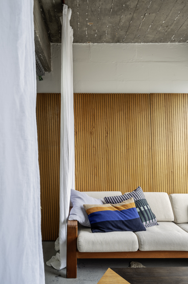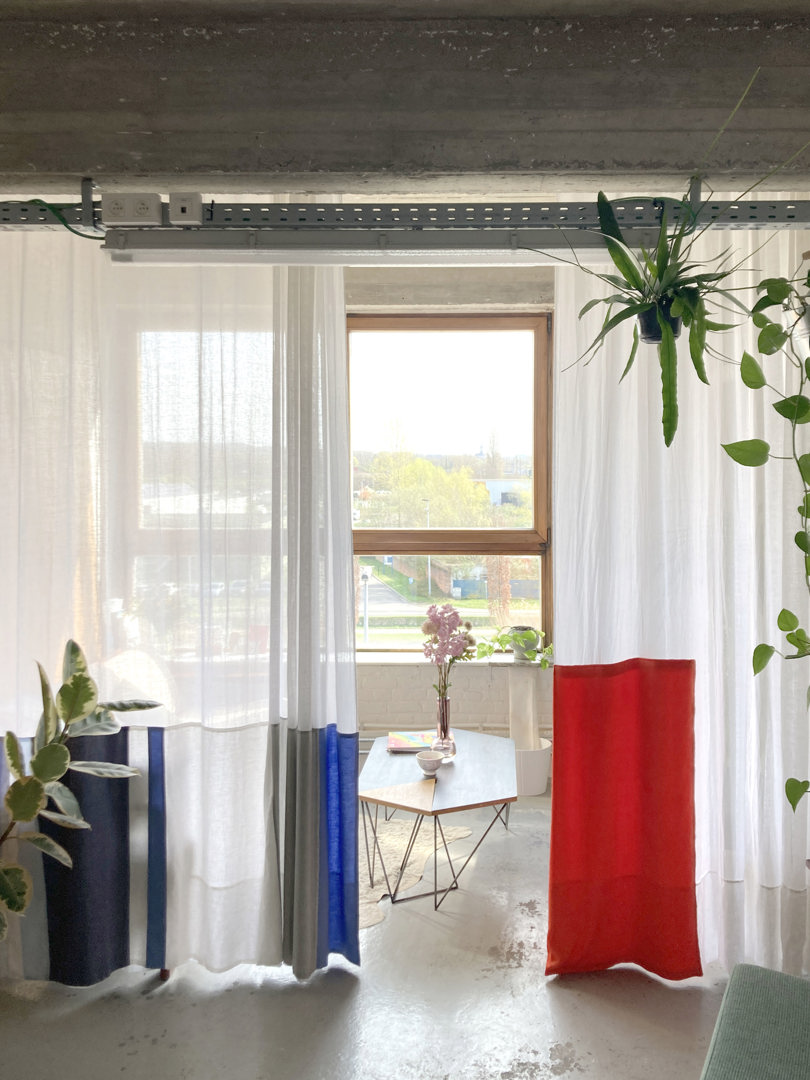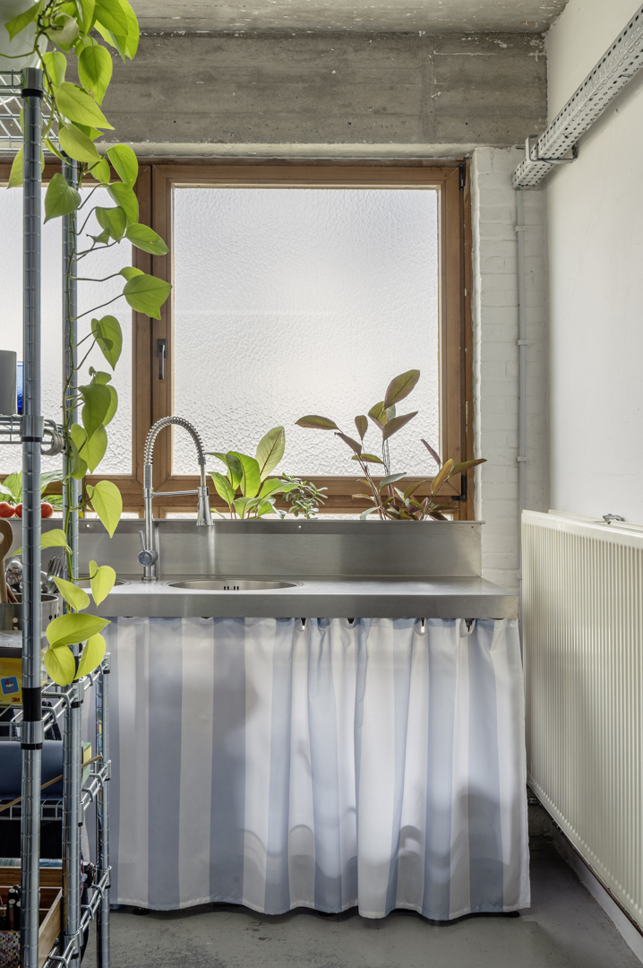 Trouver de la beauté dans la réutilisation, apporter de la chaleur dans une usine en béton brut avec un budget très serré. Chaque obstacle a apporté un nouvel aperçu. Le détail particulier de la paroi vitrée est né de plaques de verre trouvées qui n'étaient utilisables que par superposition. Complété par des appuis de fenêtre en marbre et une nouvelle porte en aluminium, cela a donné une esthétique éclectique inattendue. Le sablage du plafond a révélé la structure brute du bâtiment et s'est avéré moins coûteux que de le repeindre. Les couleurs se réfèrent au contexte existant : jaune pour le gaz, vert pour l'électricité. Le 'salon' est devenu chaleureux et calme grâce à des panneaux acoustiques en chêne récupérés et des rideaux faits maison. Pour la cuisine, nous avons reçu un bloc de cuisine inox d'occasion que nous avons fini avec des rideaux joyeux.