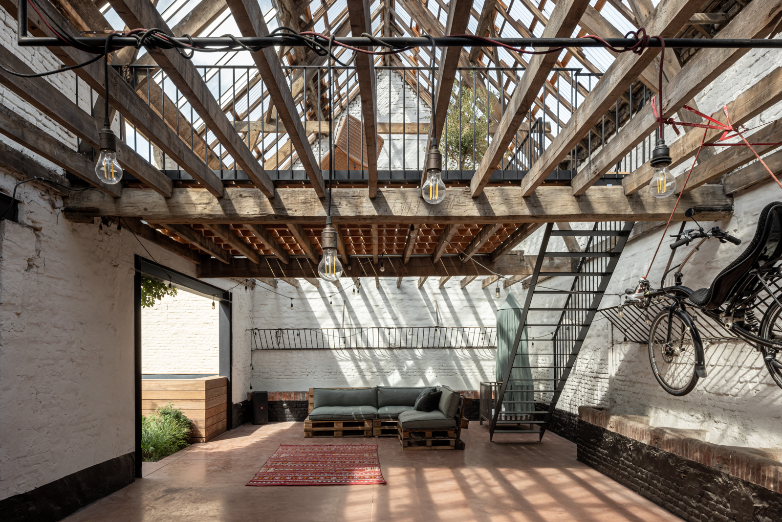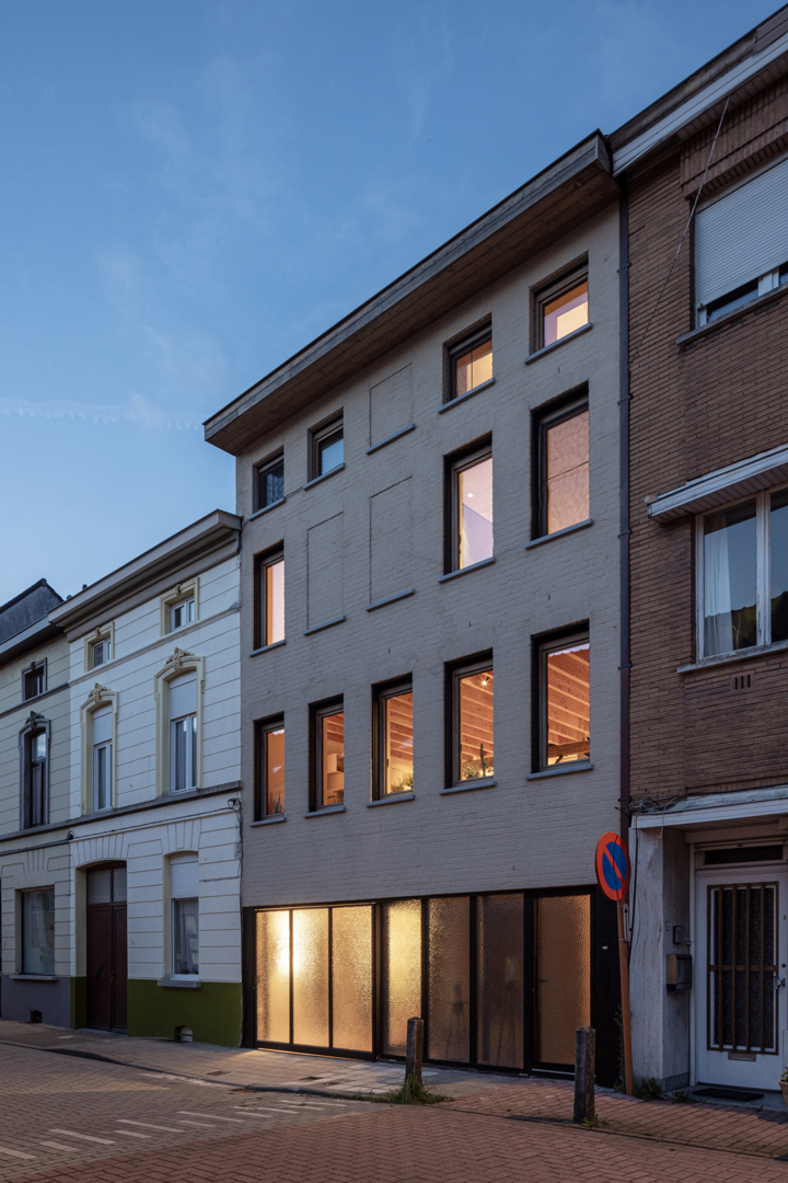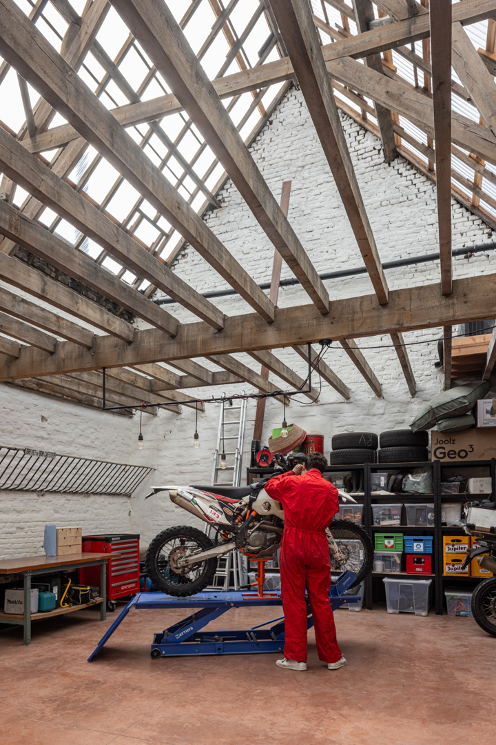 Miel et Eline ont acheté la maison d'Irene avec le café et l'écurie attenants. Le jeudi, il y avait le marché aux bestiaux hebdomadaire et donc, chaque mercredi, les vaches étaient déchargées ici et conduites à l'écurie derrière la maison. Ensuite, Irene servait les bières à bon marché dans le café, dans ce qui était considéré il y a trente ans comme l'un des quartiers les plus rudes de Gand. Aujourd'hui, ce quartier est prisé et n'a que de vagues souvenirs du passé. La maison elle-même était en mauvais état et la disposition était impratique, c'est pourquoi il a été décidé d'opter pour une RECONSTRUCTION. L'un des défis consistait à conserver l'atmosphère de l'écurie et à la relier à la maison. La structure en poutres du toit de l'écurie est impressionnante et en même temps très familière, c'est pourquoi il a été choisi de prolonger ce sentiment à la maison.