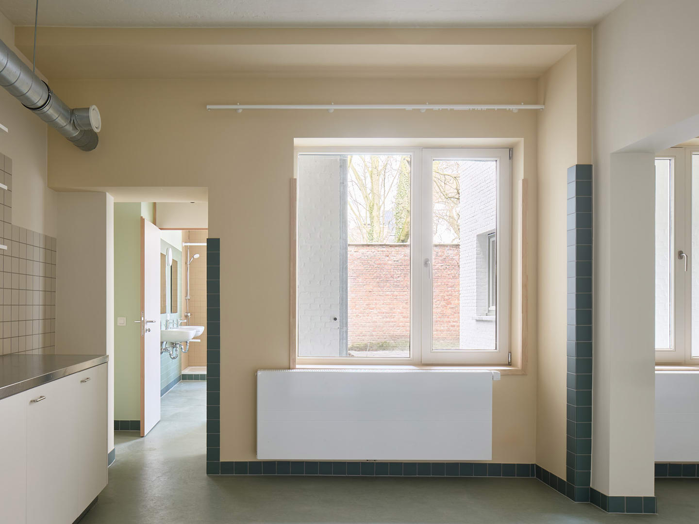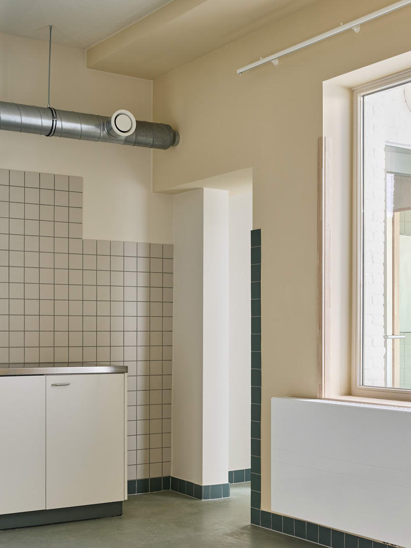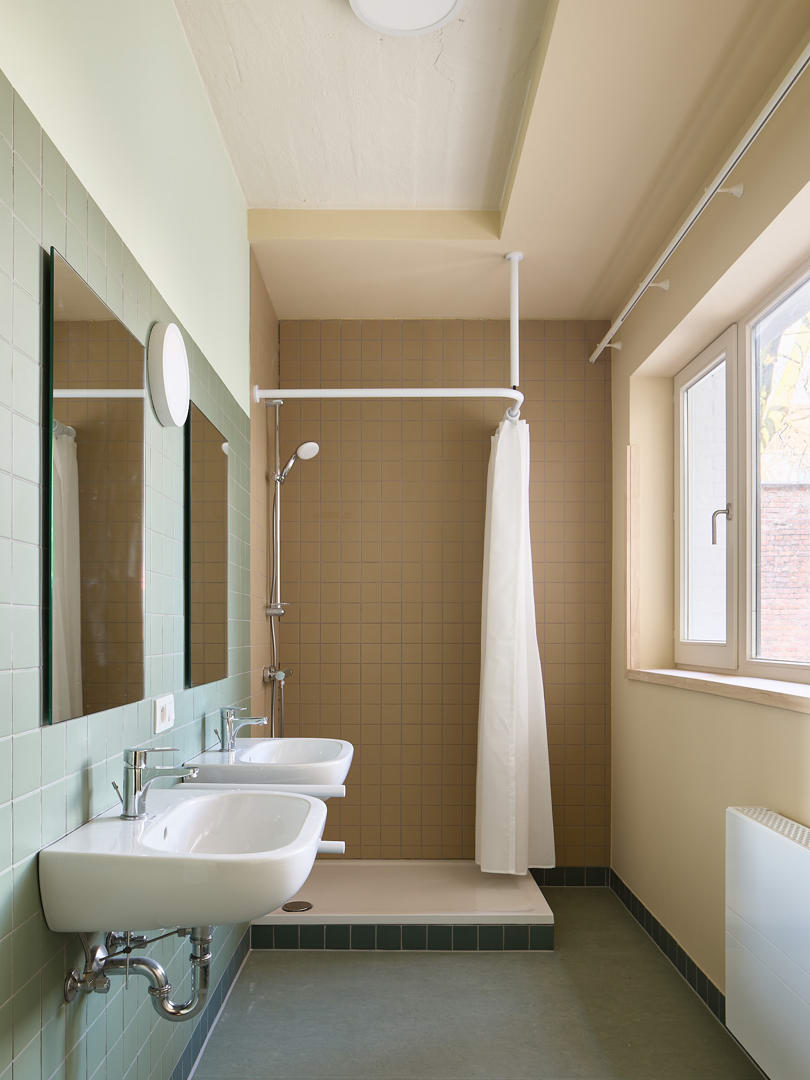 Un paramètre important du programme était la création d'une structure d'habitation flexible. Le public cible des logements d'urgence est en effet très diversifié : des personnes seules aux grandes familles. C'est pourquoi le projet ne part pas d'un habitant standard, mais d'une structure configurable dans laquelle les unités d'habitation peuvent être temporairement assemblées. À l'intérieur, les interventions ont été rendues lisibles grâce à un code couleur systématique. Les couleurs appliquées - blanc, ivoire et vert - font référence à la nature de l'intervention architecturale (éléments de construction existants, parties isolées ou nouvelles cloisons) et donnent une lecture claire des transformations spatiales. Pour les occupants qui ne peuvent pas décorer leur logement temporaire eux-mêmes, ces couleurs constituent en outre la seule forme de 'décoration intérieure'.