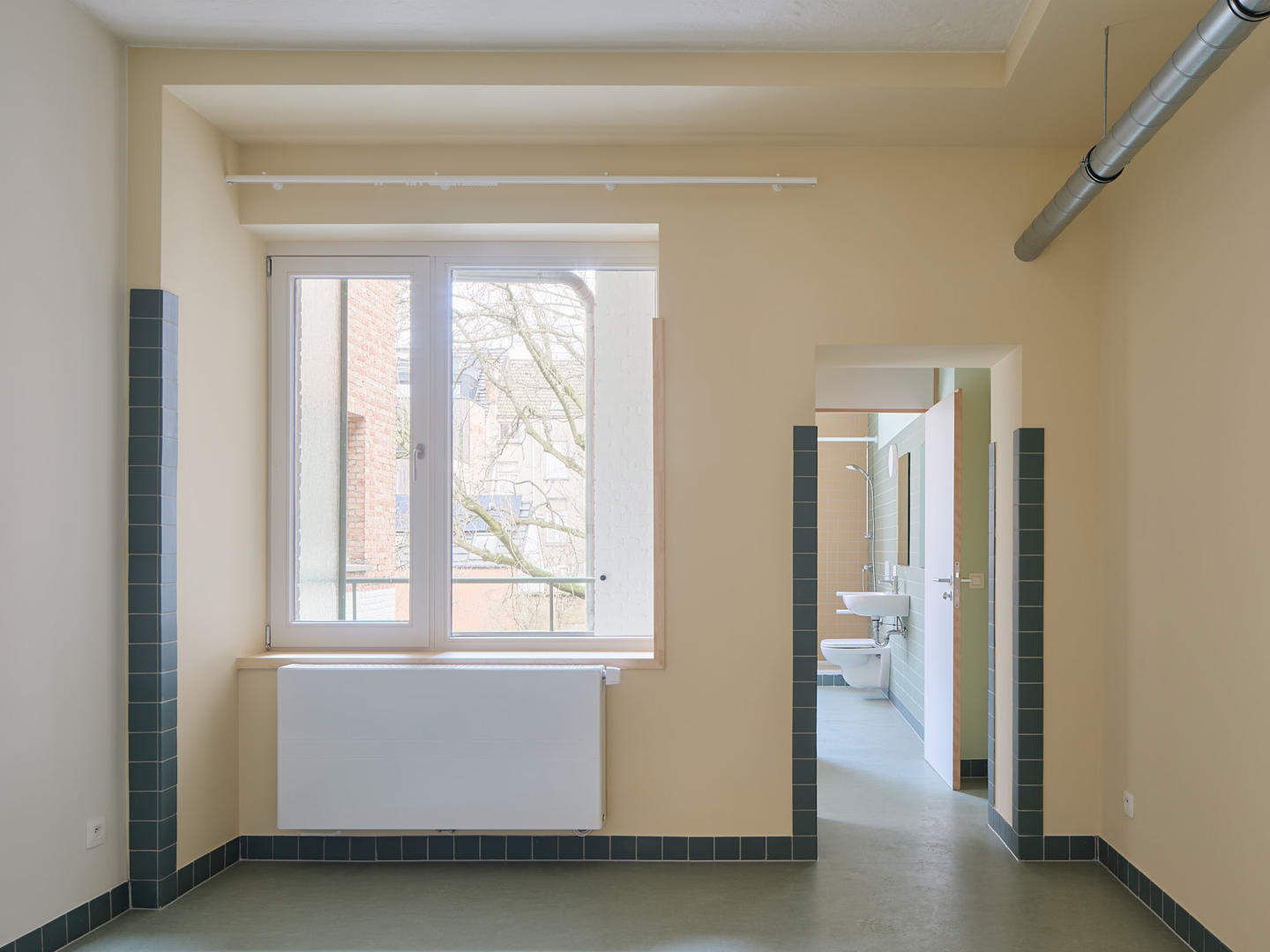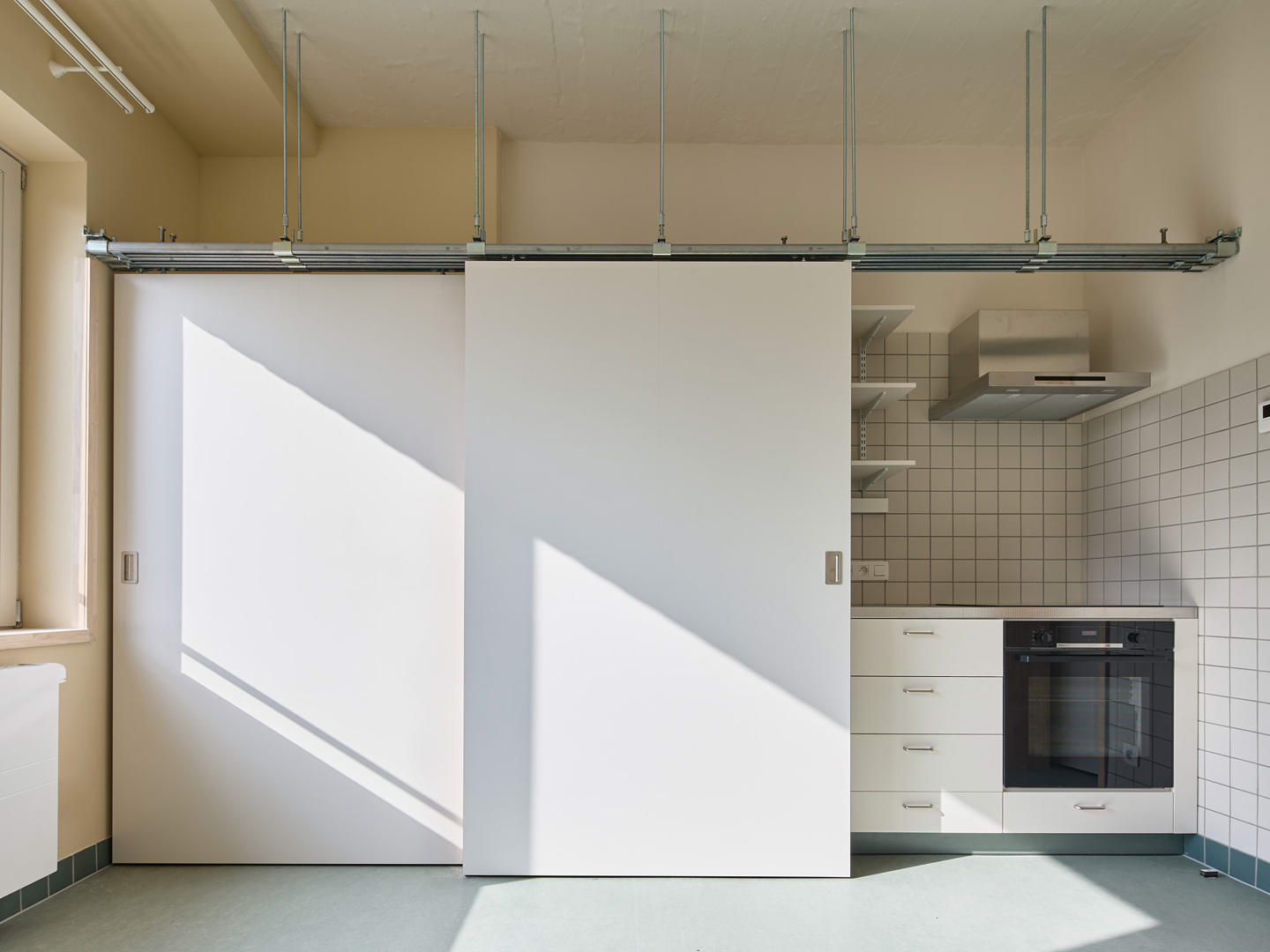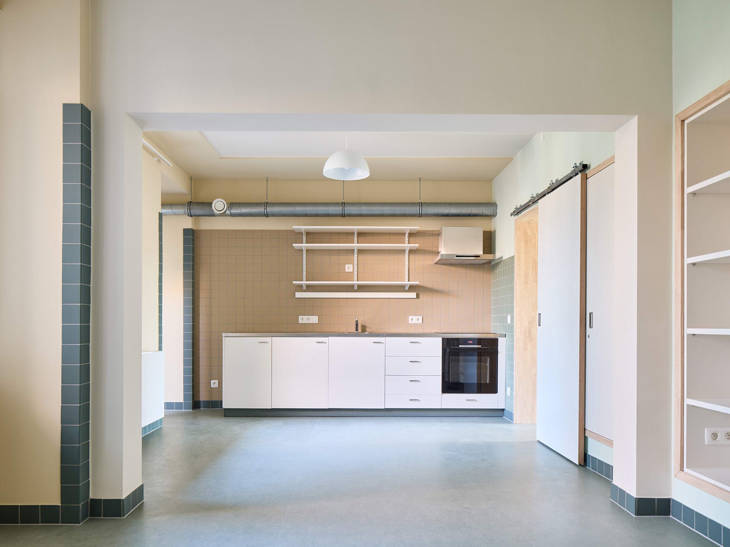 Un paramètre important du programme était la création d'une structure d'habitation flexible. Le public cible des logements d'urgence est en effet très diversifié : des personnes seules aux grandes familles. C'est pourquoi le projet ne part pas d'un habitant standard, mais d'une structure configurable dans laquelle les unités d'habitation peuvent être temporairement assemblées. À l'intérieur, les interventions ont été rendues lisibles grâce à un code couleur systématique. Les couleurs appliquées - blanc, ivoire et vert - font référence à la nature de l'intervention architecturale (éléments de construction existants, parties isolées ou nouvelles cloisons) et donnent une lecture claire des transformations spatiales. Pour les occupants qui ne peuvent pas décorer leur logement temporaire eux-mêmes, ces couleurs constituent en outre la seule forme de 'décoration intérieure'.