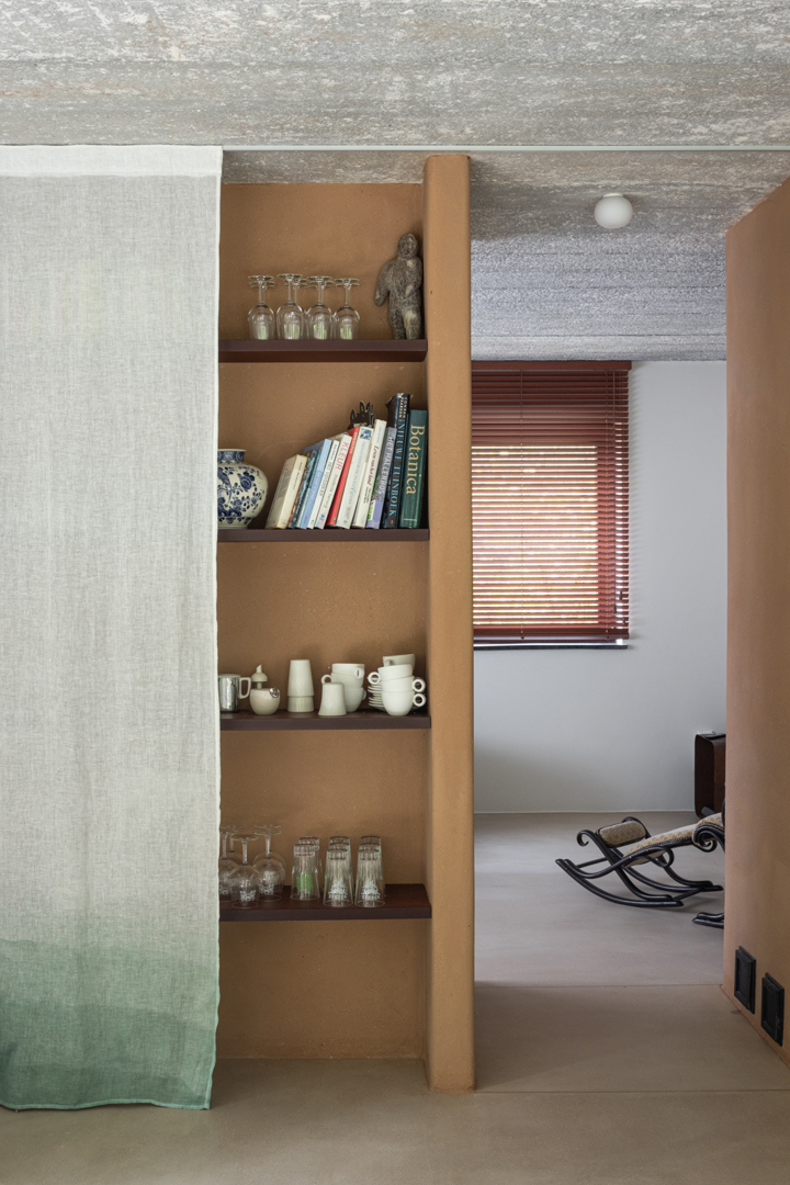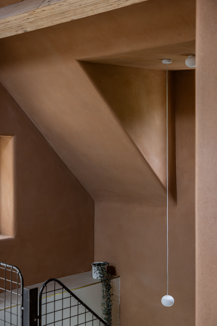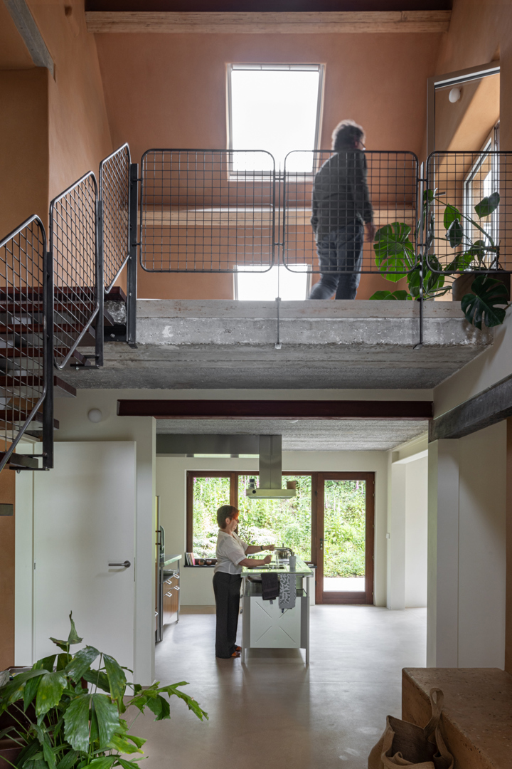 En analysant de manière critique l'état existant, on réfléchit de manière durable aux espaces disponibles existants. Grâce à une réorganisation réfléchie, le volume chauffé peut être réduit et de l'espace peut être aménagé à l'intérieur au lieu d'être élargi. Un espace est prévu pour un jardin d'hiver dans le volume du toit. Le mur massif en pisé, adjacent au jardin d'hiver, assure l'inertie et sert de tampon thermique. En outre, un poêle en argile est installé comme chauffage central pour remplacer l'ancienne chaudière au mazout. La possibilité d'un logement à vie contribue également à la flexibilité et à la durabilité de la maison.