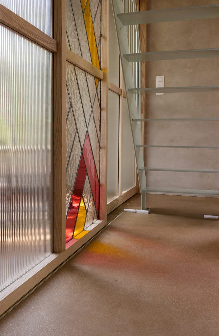 Dans ce projet, Karibu rénove l'intérieur du rez-de-chaussée d'une maison unifamiliale. Le design se concentre sur une utilisation efficace de l'espace, des matériaux naturels et l'apport de lumière pour avoir un impact maximal sur la qualité de vie dans la maison avec un minimum d'efforts. L'architecture met en valeur la qualité existante en guidant l'habitant à travers des éléments clés et en soulignant la lumière du soleil entrante avec des vitraux colorés.