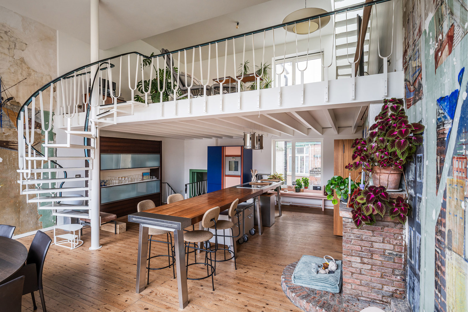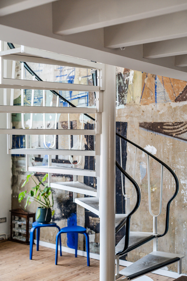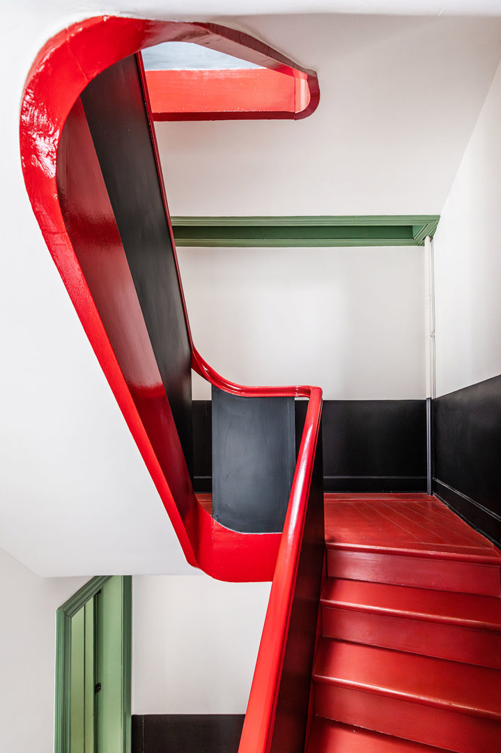 Le grand défi était d'explorer avec les commanditaires les limites de la préservation possible de l'esprit de la maison atelier par rapport à la facilitation du mode de vie contemporain. Nous avons cherché des solutions de conception pour apporter lumière et air dans la maison : le résultat a été quelques ouvertures de fenêtres judicieusement placées dans la façade arrière, un puits de lumière élaboré dans le toit, une légère élévation des sols dans l'atelier et une percée vers le toit avec une terrasse et une zone verte. Lors du démantèlement des murs, de grandes peintures murales ont été découvertes, fixées minutieusement et apportant une importante prestance à l'ancien atelier. Rénovation, restauration et ajouts sont imbriqués et aboutissent à un projet durable, offrant une grande polyvalence d'utilisation.