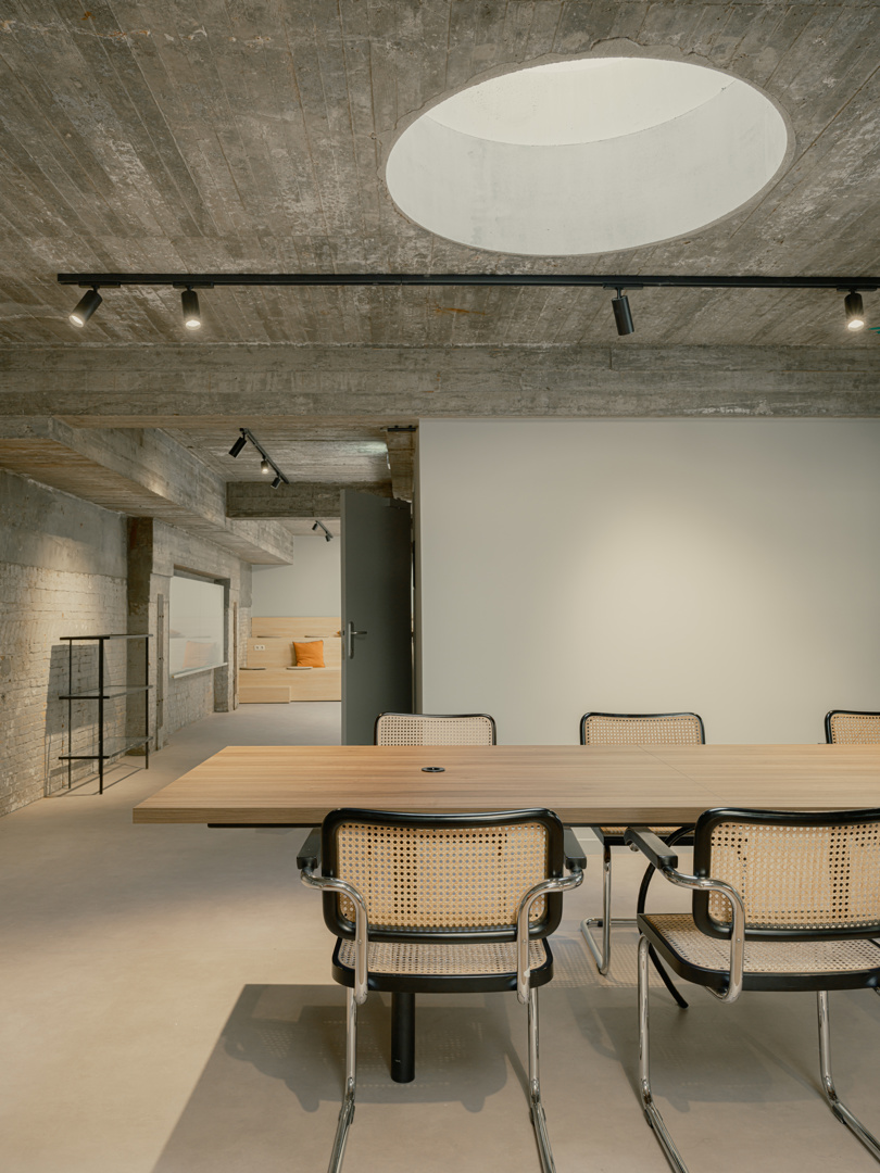 Le projet mise fortement sur la réutilisation et la prolongation de la durée de vie de la structure existante. En transformant le bâtiment plutôt qu’en le remplaçant, l’empreinte carbone a été considérablement réduite. Le mobilier et les éléments existants ont été réutilisés ou adaptés, complétés par des pièces vintage soigneusement sélectionnées. Des systèmes de cloisons modulaires permettent des adaptations futures sans déchets de démolition. De plus, l'impact opérationnel a été réduit grâce à une isolation améliorée, un vitrage haute performance, des techniques écoénergétiques et un éclairage LED. Cette combinaison de pensée circulaire, de flexibilité et d'optimisation technique rend le projet durable à plusieurs niveaux.