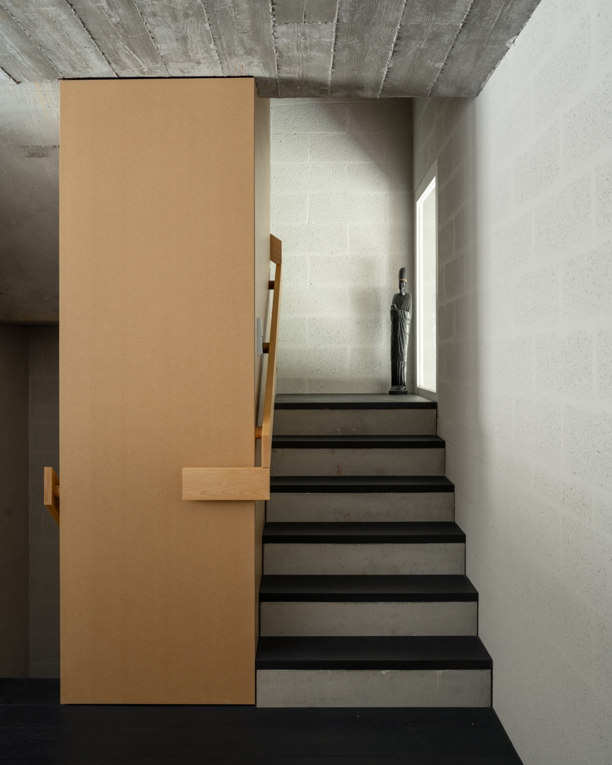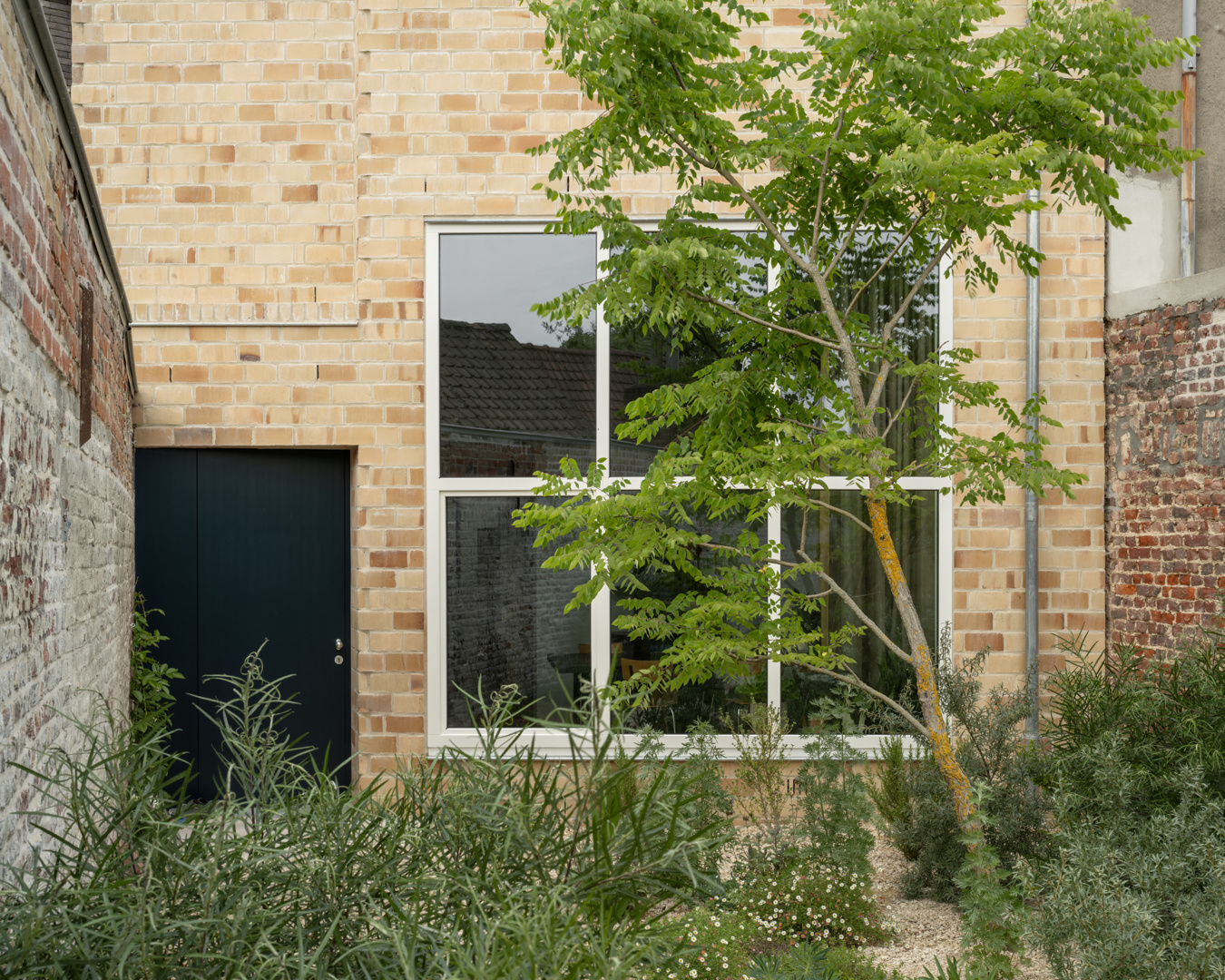 [Parce que nous voulons vivre en centre-ville et avec le désir d'un espace extérieur vert, ce terrain profond à Courtrai nous a attirés. Sur cette parcelle bâtie, s'étendant entre rue et voie ferrée, nous voulions réaliser notre propre maison familiale compacte avec un jardin généreux. La situation existante, un amalgame typiquement flamand de bâtiments en enfilade, n'abritait encore aucune de ces qualités. L'ambition était d'y réaliser un retournement particulier, avec une maison qui absorbe la ville et un jardin qui, dans le prolongement de la maison, génère non seulement une vue, mais aussi un espace de séjour. Notre foi dans le rôle émancipateur de l'architecture a conduit à une mission de conception supplémentaire. Comment en effet, en plus d'un foyer agréable, réaliser un projet qui puisse améliorer le quartier, la ville et la société.]