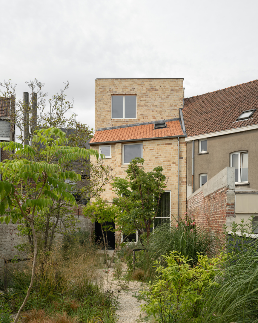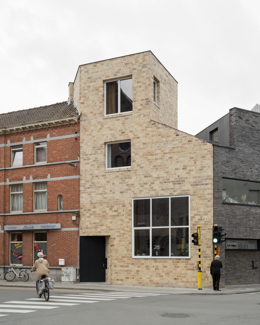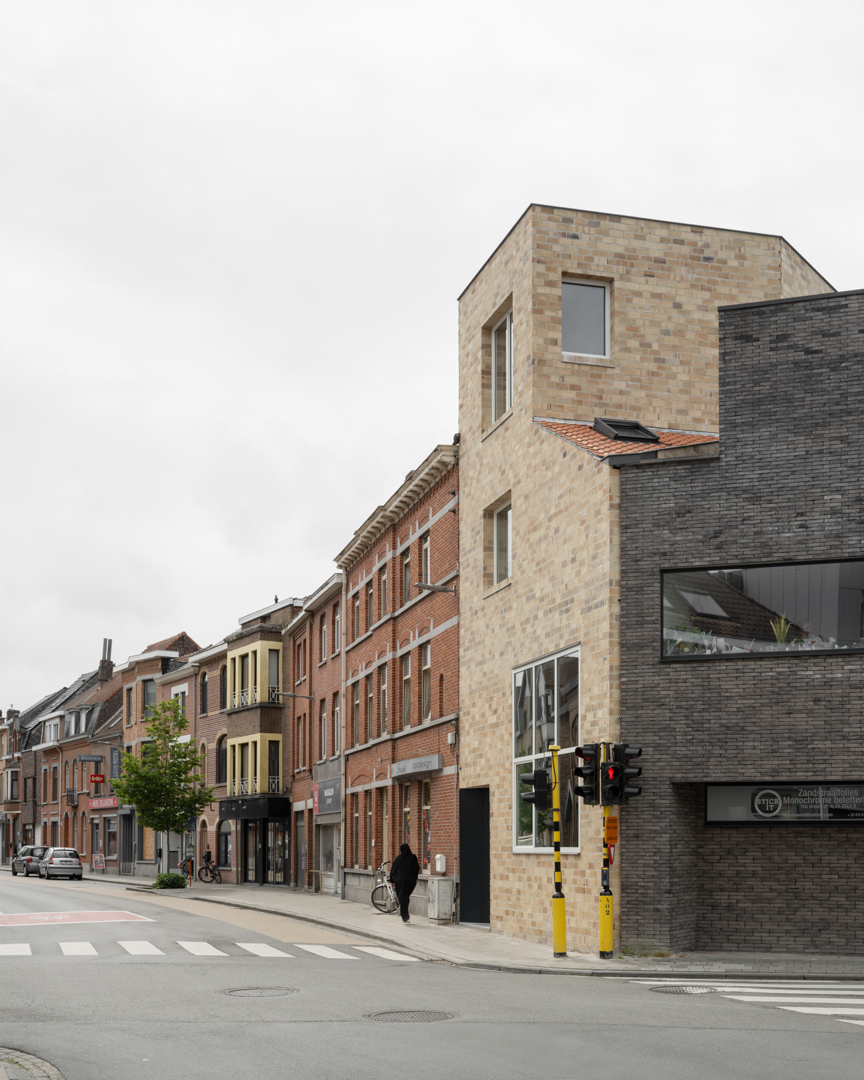 [Que faire de la typologie des maisons mitoyennes en ville est peut-être bien la plus grande question architecturale de notre époque. À notre avis, cette question ne peut être répondue uniquement écologiquement, mais doit également être abordée socialement. Le ballet de rue, comme Jane Jacobs l'avait conçu, est certainement encore très éloigné en Flandre. Pourtant, cela constitue une composante fondamentale d'une ville vivante, durable et inclusive. Cette maison veut, avec une vision alternative de la durabilité et surtout la recherche d'interaction sociale avec la ville, ouvrir le débat sur la façon dont une maison peut s'implanter dans la ville. Elle apporte ainsi une petite contribution au ballet de rue d'un quartier en développement à Courtrai, mais peut-être une contribution plus importante à la question du logement urbain.]