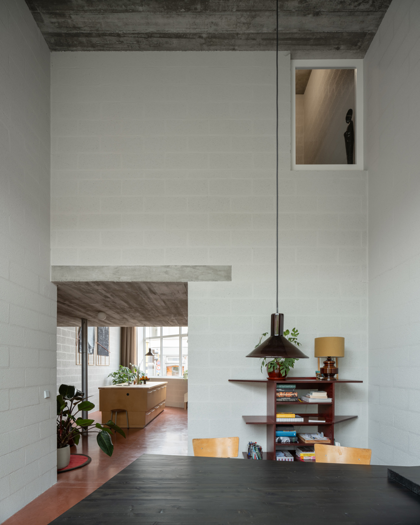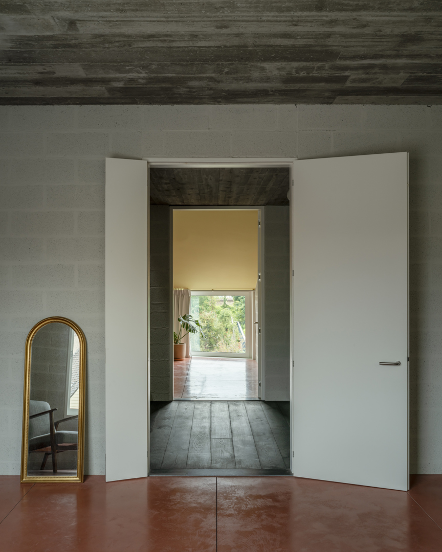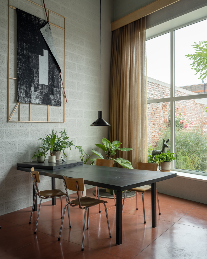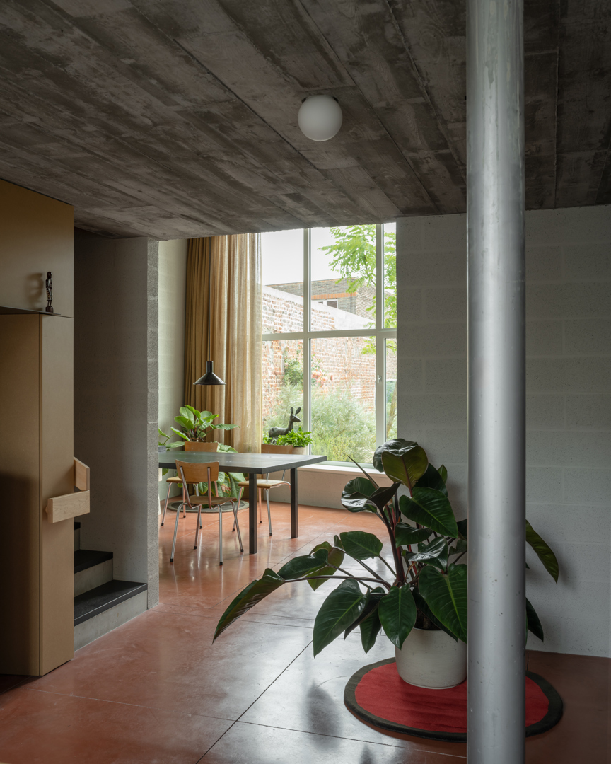 [Réaliser un projet pour les cent prochaines années a conduit à des choix mûrement réfléchis. Un choix résolu a été fait pour une nouvelle construction compacte et robuste avec des matériaux thermiquement inertes et une attention particulière pour la lumière du jour abondante et le gain solaire. Une habitation bien pensée sans grands investissements techniques tels que le chauffage par le sol, la géothermie, les pompes à chaleur ou de nombreux panneaux photovoltaïques. La maison entière est en effet chauffée avec un seul poêle à pellets et n'a pas de refroidissement (passif ou actif). Avec un désencombrement fondamental, une injection de paysage sauvage et biodiversifié et une habitation qui se serre contre la rue, ce n'est pas seulement un exercice de construction compacte, mais aussi une démonstration de la manière dont la ville peut être reconquise. La maison active la rue et laisse en même temps de la place pour un vert significatif.]