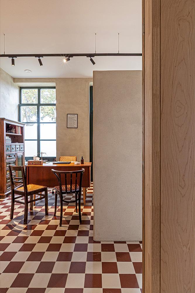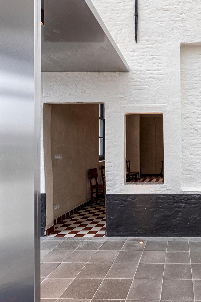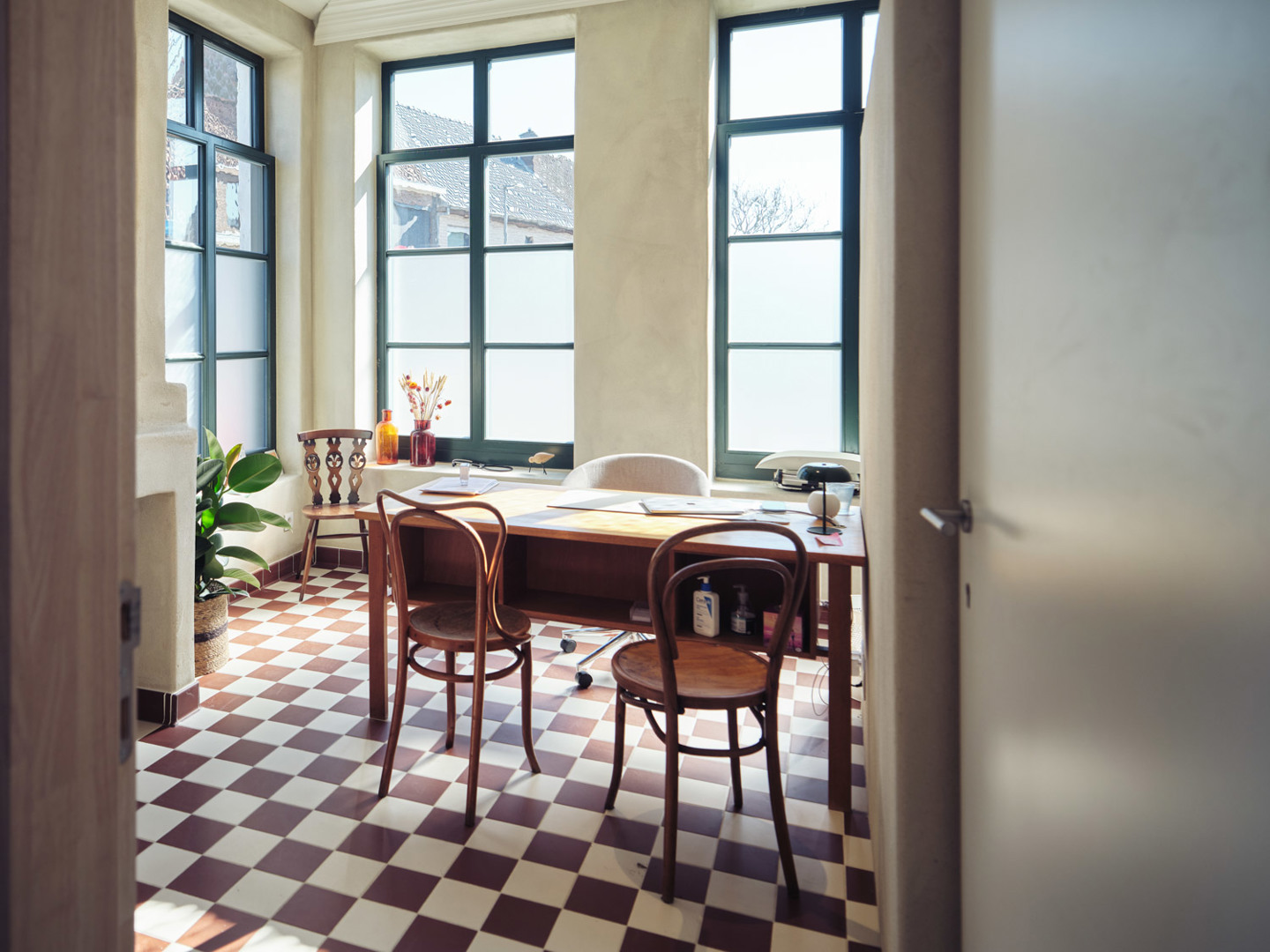 Après une rénovation, une restauration et une intervention architecturale innovante, la maison de village a retrouvé sa gloire d'origine avec une nouvelle affectation significative en tant que maison pluridisciplinaire de soins. La matérialité joue un rôle central dans le design : des murs perspirants en chanvre-chaux et plâtre argileux, des carreaux de petit format en damier en clin d'œil aux carreaux de ciment d'antan, et des moulures de plafond re-dessinées qui font revivre le caractère originel du bâtiment. Un choix conscient de matériaux durables a été fait, qui ne donnent pas une impression stérile et qui contribuent à un climat intérieur sain. Pas de solutions standard, mais des accents chaleureux et domestiques plutôt que l'uniformité médicale typique. En somme, un cabinet tourné vers l'avenir dans un bâtiment chargé d'histoire.