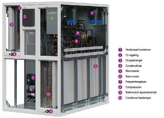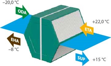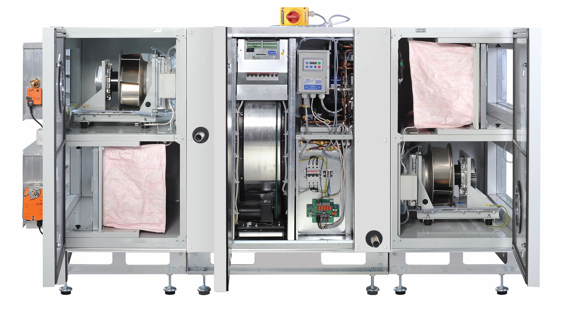 En hiver, un rotor thermique hygroscopique efficace récupère, dans un premier temps, la majeure partie de la chaleur de l’air extrait. Dans un deuxième temps, la chaleur excédentaire est captée du côté de l’air évacué via un évaporateur, redirigée par le compresseur, puis transférée à la batterie de l’air soufflé. En mode refroidissement, l’énergie frigorifique est également récupérée via le rotor thermique. Cela permet un chauffage et un refroidissement particulièrement économes en énergie.
