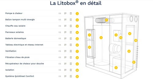 La Litobox® est une installation HVAC modulaire qui combine dans un seul appareil, sur 3 m2, une pompe à chaleur, un chauffe-eau solaire, une installation photovoltaïque, une batterie domestique, un filtre d'eau de pluie, un système de ventilation, un tableau électrique et un réseau Internet. L'appareil est installé en moins d'une heure.