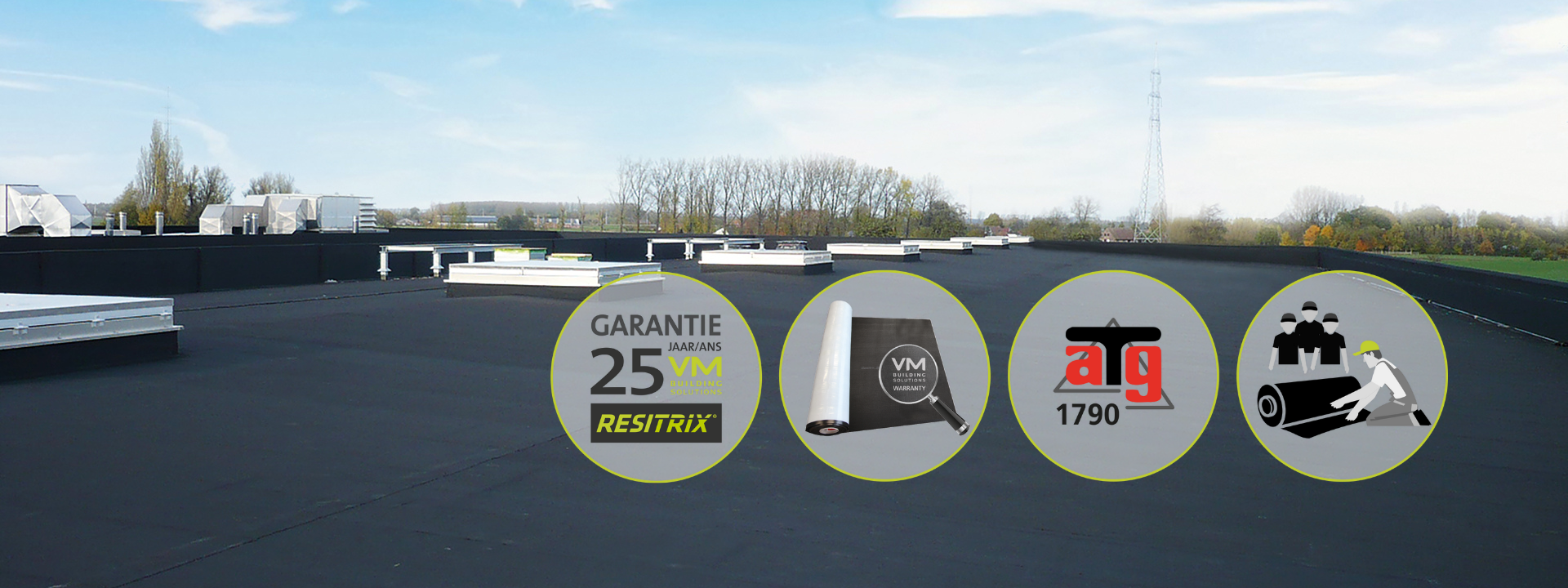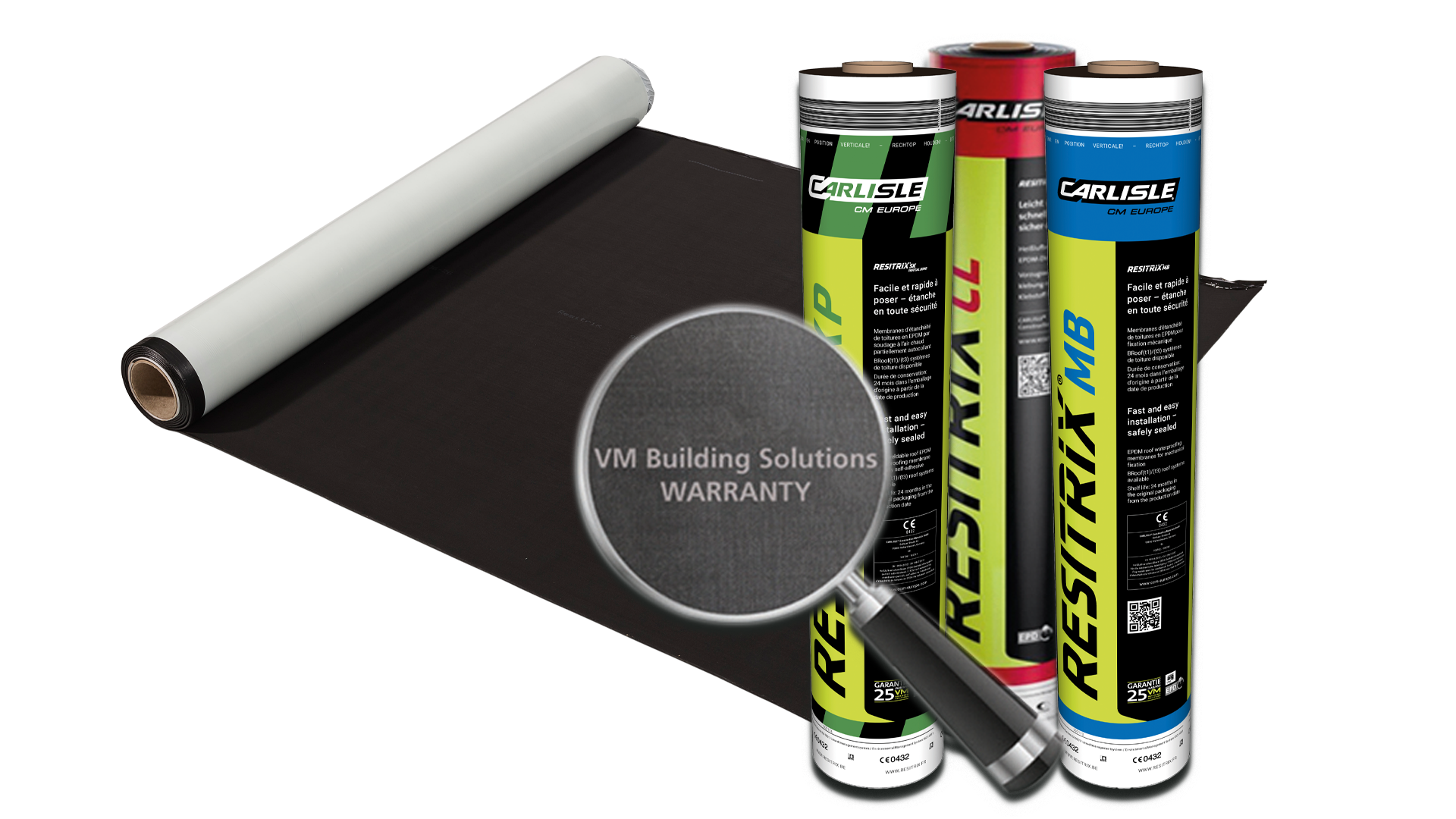- Respectueux de l’environnement Jusqu’à 25 ans de garantie produit: La seule membrane EPDM en Belgique avec une garantie produit de 25 ans ! Valable uniquement pour les membranes Resitrix achetées via un Resitrix Authorized Dealer, clairement reconnaissables aux rouleaux vert/noir et au label de qualité VM Building Solutions Warranty apposé directement sur la membrane.