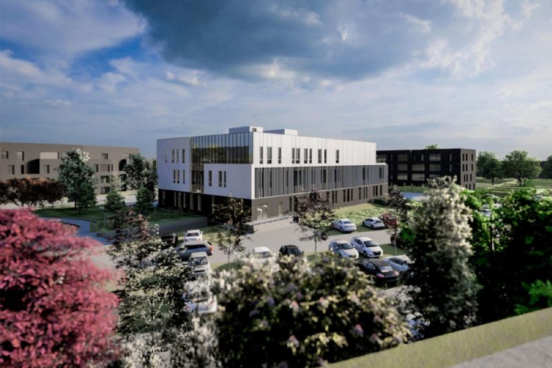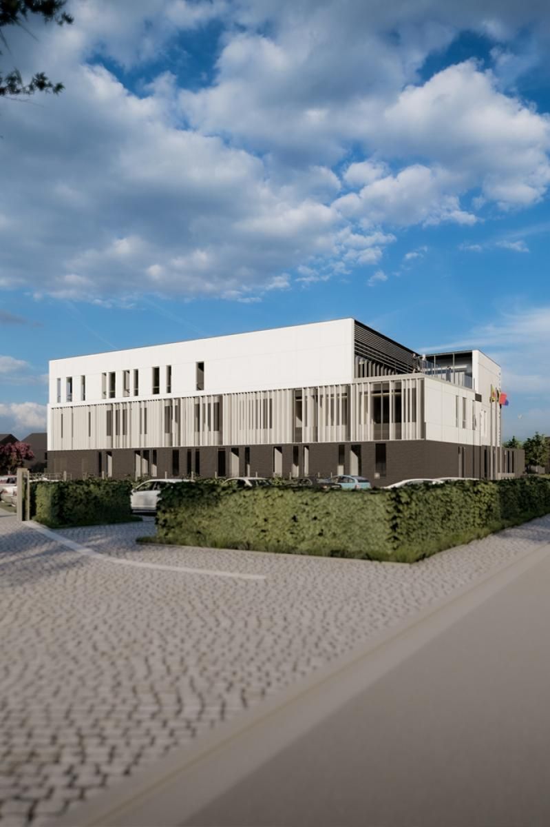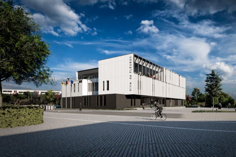 Le nouveau bâtiment se décompose en deux volumes traités de façon contemporaine et minimaliste. D’une part, un socle d’un niveau qui assure la connexion avec la place et l’entrée au centre administratif. Le socle est vitré côté esplanade afin d’affirmer son ouverture au public et la transparence vers l’entrée. D’autre part, un volume de deux niveaux en porte-à-faux semble « flotter » au-dessus du socle.