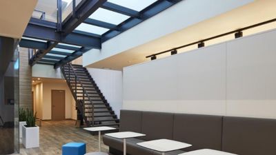 Le fabricant de produits d'étanchéité et d'isolation SOPREMA a inauguré en 2017 son nouveau centre de formation et de connaissances pour toute l'Europe du nord et de l'ouest à Grobbendonk. Le bâtiment, conçu par Assymetric Architectes Associés et construit par Mathieu Gijbels, place l'inspiration et la transmission de connaissances au centre du projet.
