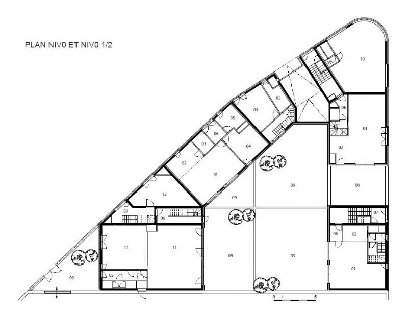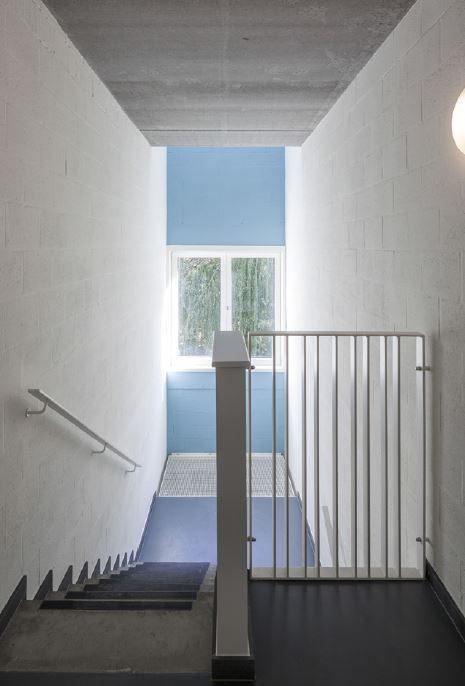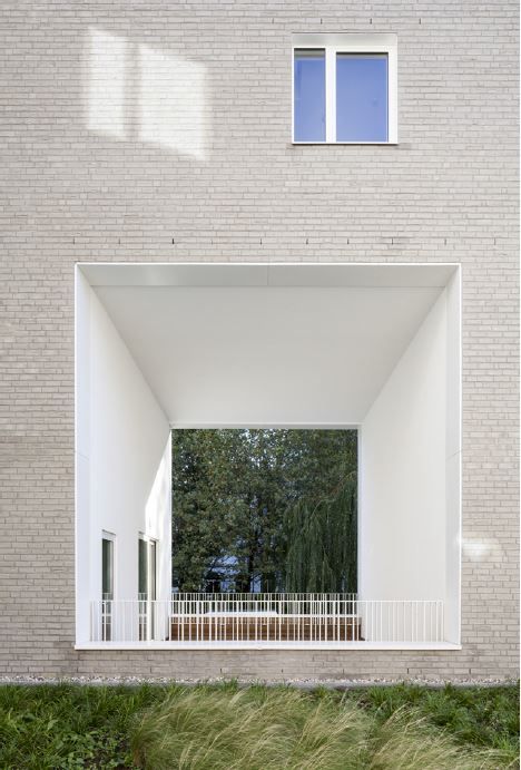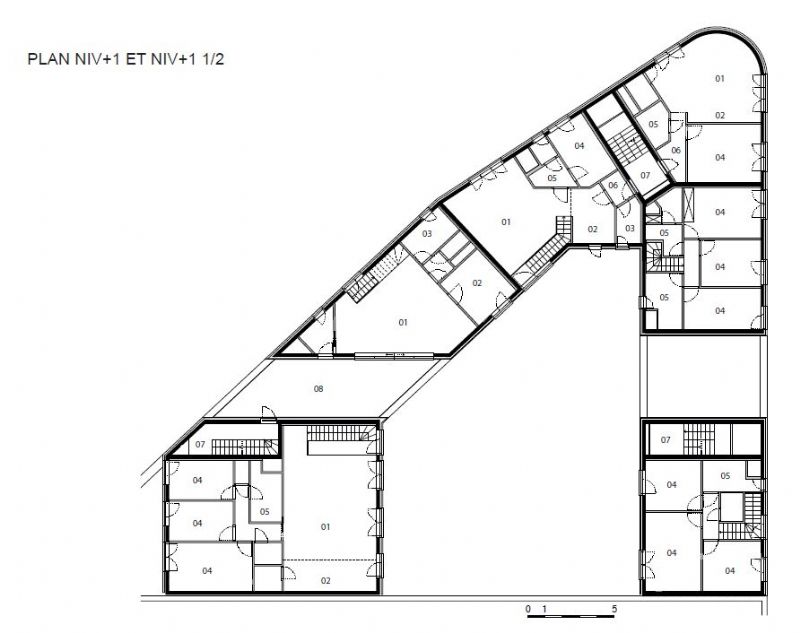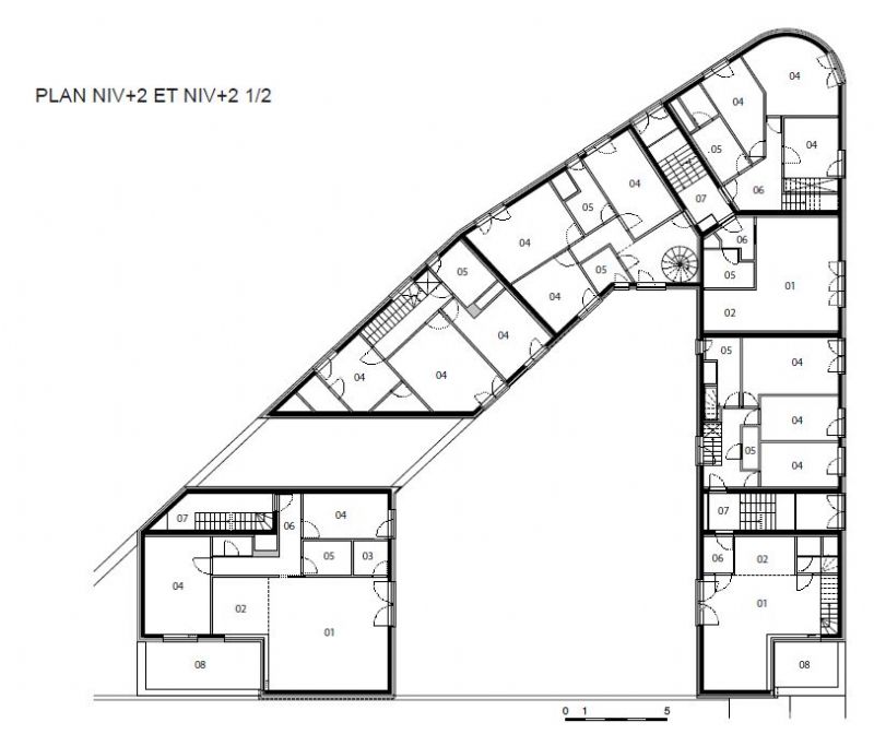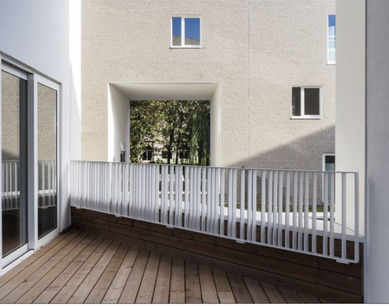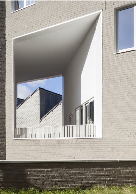 Une différence de niveau a été créée entre les deux ailes qui se font face pour préserver l’intimité des habitants et maximaliser l’apport de lumière naturelle dans le parking semi-enterré. Chaque habitation bénéficie d’un espace extérieur orienté Sud/Sud-Ouest en fonction des découpes dans le volume.