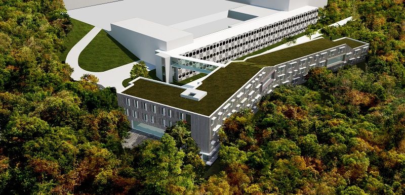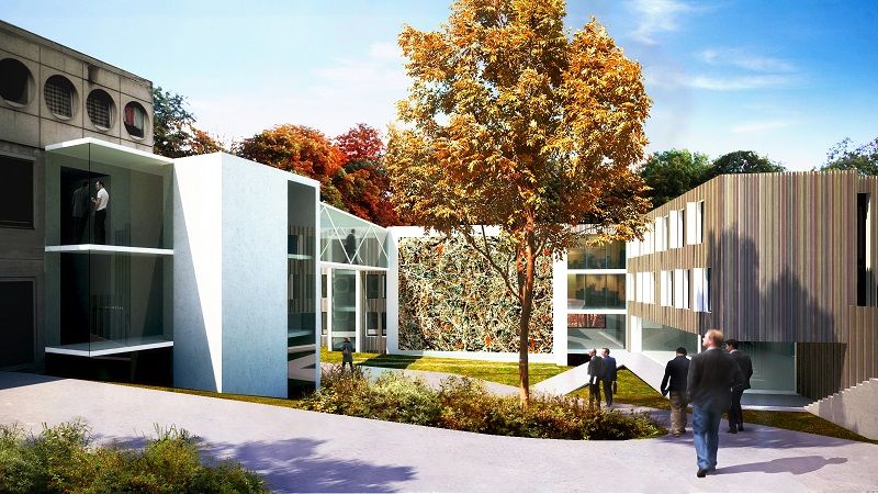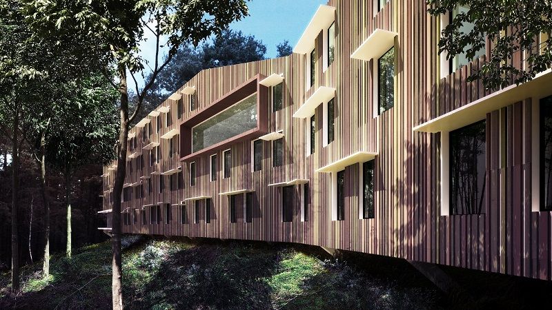 L'intervention complète la composition générale : elle apparaît telle une ligne claire dans le paysage qui prolonge l’arrête visible de l’internat existant et s’incline au gré de la dénivellation naturelle du terrain. Seul le bâtiment principal restera visible depuis les bords de Meuse. Le nouveau bâtiment, posé sur pilotis, préserve le terrain naturel, l’accompagne et oriente le regard vers de nouvelles perspectives.