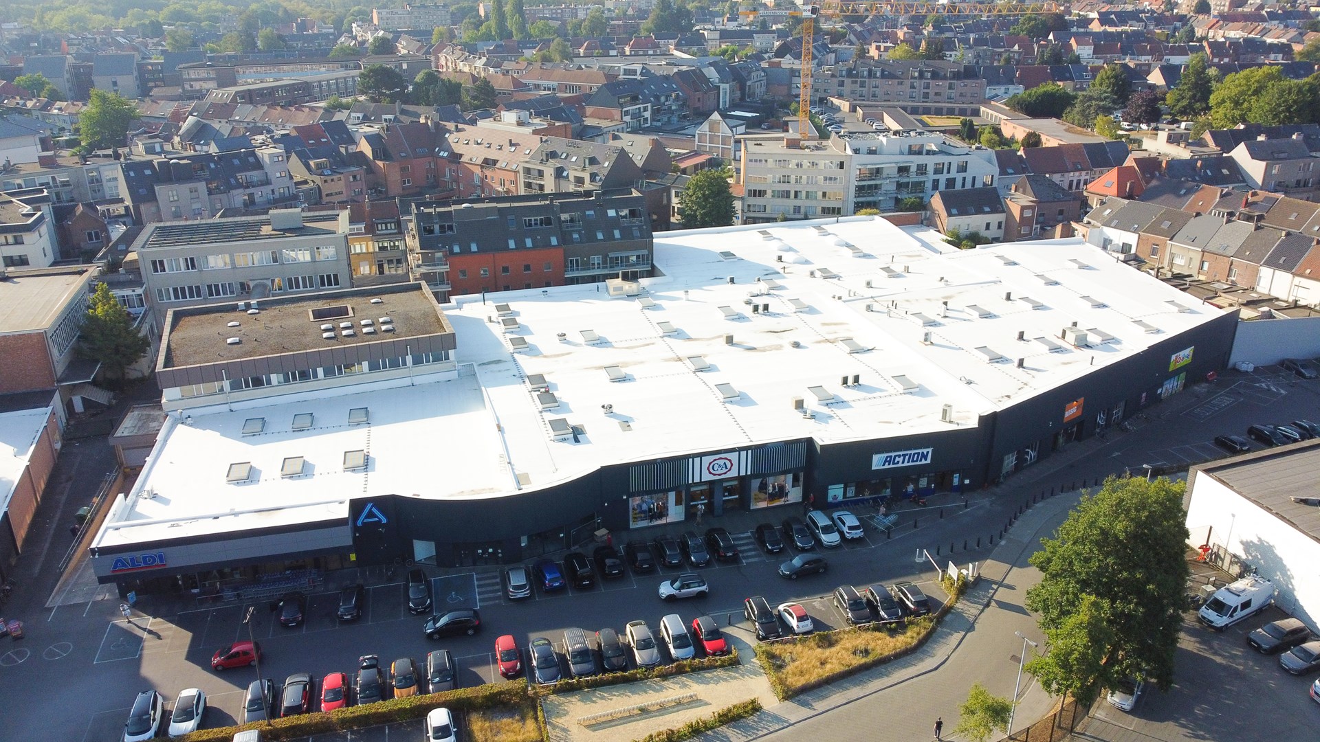 À côté du complexe commercial se trouvaient autrefois les Keizershallen, les locaux où les groupes de carnaval construisaient leurs chars à l’époque. Aujourd’hui, cette activité a été transférée à un autre endroit de la ville. Les halls d’origine ont été démolis il y a quelque temps déjà et le terrain fait désormais fonction de parking. Il y a deux ans, Retail Park Aalst a fait rénover les façades du complexe commercial qui se trouve sur le même site et qui date de 1973. Tout récemment, c’est le toit – d’une superficie totale de 10 500 m² – qui a fait l’objet d’une rénovation. À l’exception des bureaux (d’une surface limitée) sur l’un des coins du toit, qui feront l’objet d’une rénovation totale ultérieure, l’ensemble du toit a été renouvelé et préparé à l’installation de panneaux photovoltaïques.