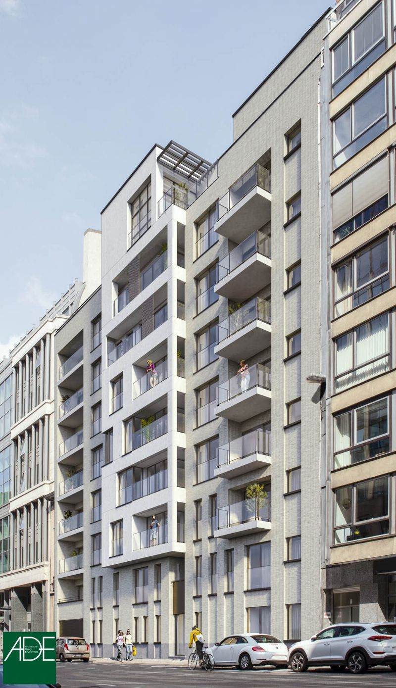 Le projet dans son ensemble est conçu afin de s’intégrer dans les alignements des immeubles en front de bâtisse en s’y raccordant de manière fluide avec des textures et une palette de tonalité harmonieuse. L’idée était également d’amener de la verticalité dans les façades afin d’éviter l’effet massif de celles-ci et de favoriser l’apport de lumière dans les espaces intérieurs tout en jouant sur des volumes entrants et sortants du front de bâtisse.