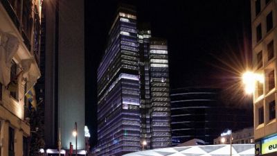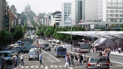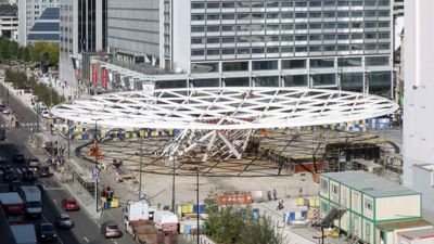 "La place Rogier est l’un des points de friction bruxellois, situé au croisement de quartiers très différents : quartier Nord, Saint-Josse et le pentagone. Depuis le déplacement de la Gare du Nord dans les années cinquante de la place Rogier au quartier Nord, l’endroit semble sans vie. Pourtant, il s’agit d’un nœud de première importance pour les transports en commun, avec trois lignes de métro en sous-sol et une halte de bus en surface qui reçoit trois bus à la minute. Le projet de réaménagement a pour ambition de créer une nouvelle cohérence entre l’espace public et le transport en commun, pour redonner à la place son rôle de lien et inscrire le lieu dans la ville. Est ainsi proposée une nouvelle articulation spatiale entre la petite ceinture et la place, reliées entre elles par une large zone piétonne. Sur la petite ceinture, voitures et bus roulent sur des bandes séparées, tandis que la zone centrale, arborée, accueille flâneries et activités citadines. La place quant à elle, dégagée de toute circulation automobile de transit, redevient un espace fluide. Un nouvel atrium, construit dans les sous-sols existants, fournit lumière et accès direct au métro, à un parking souterrain et à des salles de congrès. Atrium et halte des bus sont recouverts par un auvent circulaire de verre et d’acier, portant sur un noyau et qui déborde aussi bien sur la place que sur la petite ceinture.