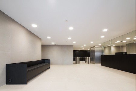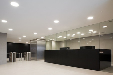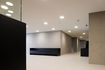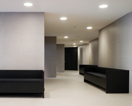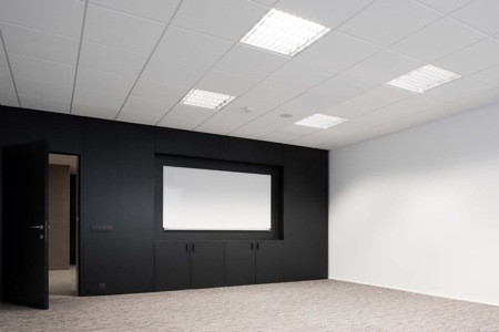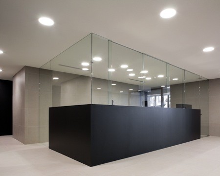 L'aménagement de la zone d'entrée avec le meetingcenter annexe datait du début des années 80 et ne répondait plus aux normes et souhaits actuels. La zone à réaménager fut entièrement isolée. Une enveloppe sous la forme d'une cloison noire fut posée tout autour, délimitant clairement la zone au milieu d'un ensemble plus vaste. A l'intérieur de cette 'boîte' ont été placés différents volumes (comptoir, salles de réunions, cellule sanitaire, cofee-corner, ...). L'espace entre les volumes fait office d'espace de rencontre informel et s'adapte parfaitement à l'entrée. On crée de cette manière un semble plus grand tout en donnant au hall d'entrée l'allure désirée.