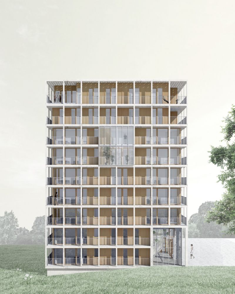 Six tours proposant au total 160 logements, avec des bâtiments minimisant leur emprise au sol et, par leur gabarit, crée un lien naturel avec l'environnement direct, formant deux 'clairières habitées'.