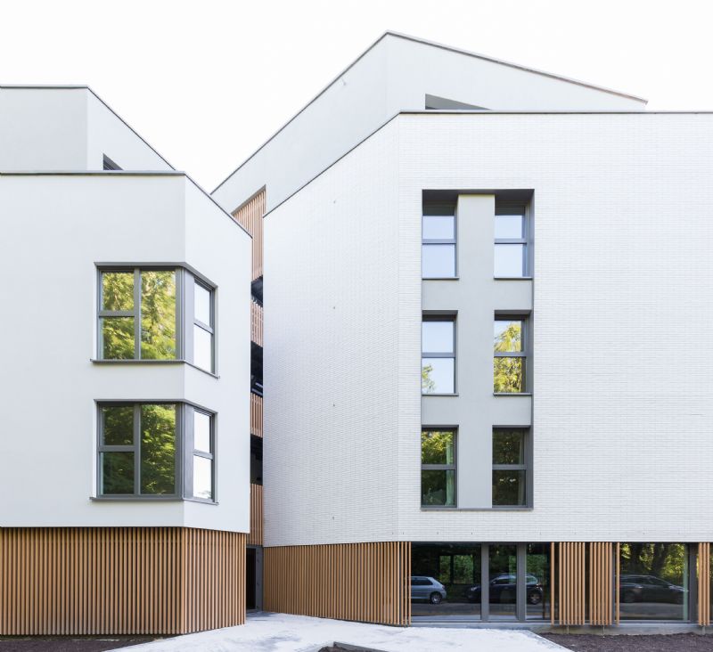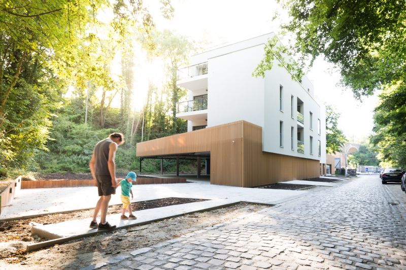 L’immeuble Roseau, comportant 9 appartements et une zone de bureaux est un programme mixte restreint sur une parcelle à la forme triangulaire compliquée, et d’un gabarit variable, voire élancé. Le projet est en outre implanté dans une zone Natura 2000. La particularité de cet ensemble est la circulation verticale extérieure, matérialisée sous forme d’une ‘faille’ entre les deux volumes principaux.