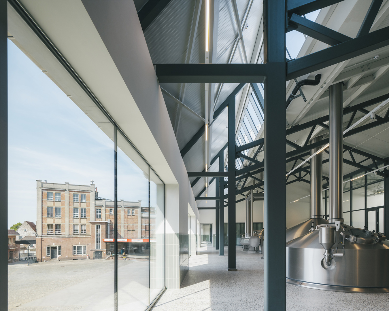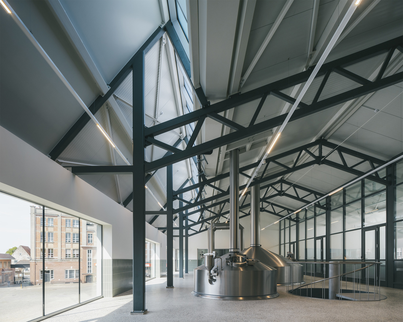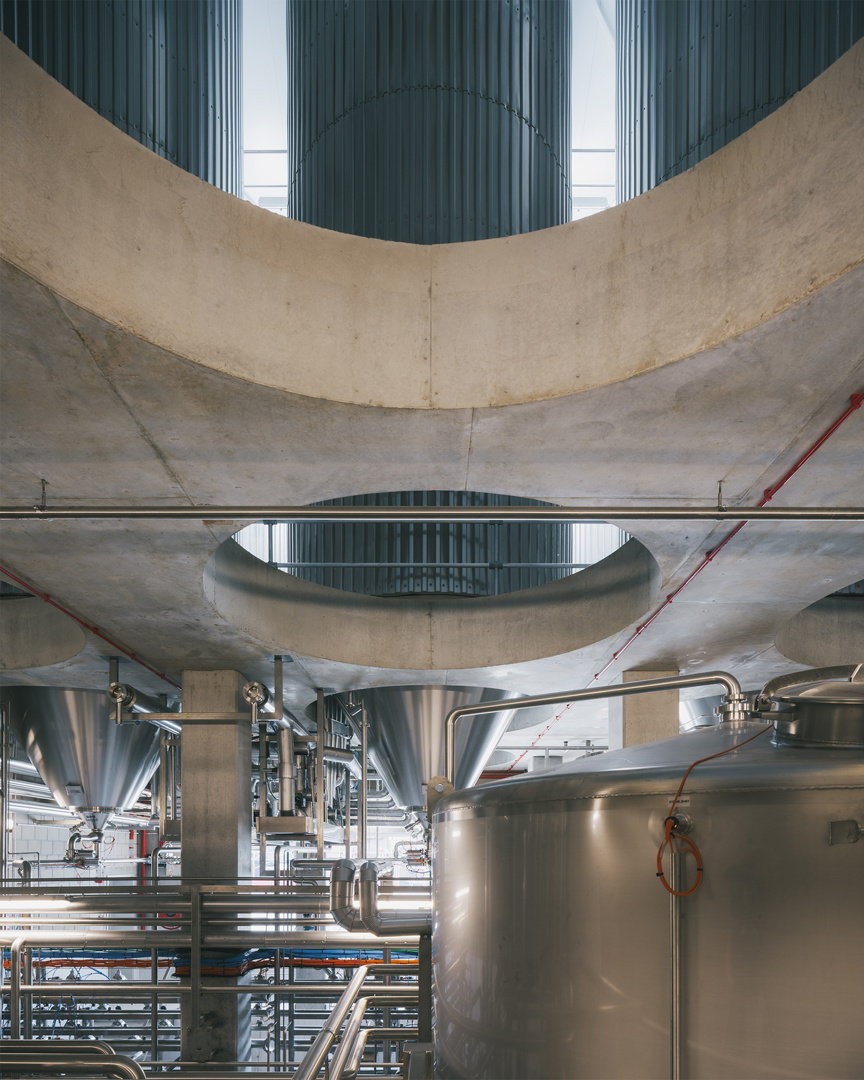 Binnenin vertrekt het ontwerp van de oorspronkelijke doorsnede. Op een robuuste betonnen tafelstructuur staan de brouwketels en gisttanks opgesteld, terwijl het gelijkvloers plaats biedt aan technische installaties. Een nieuwe staalstructuur ondersteunt het dak, waarin royale daklichten overvloedig daglicht binnenbrengen. Bovendien krijgt de bezoeker een zorgvuldig ontworpen parcours: vanaf de koer loopt een lus die via de overdekte loskade langs de brouwzaal en gisttanks naar een uitkijkplatform boven de bottelarij leidt. Zo ontstaat een traject dat productie, geschiedenis en gebouwde context op een vanzelfsprekende manier verbindt.
