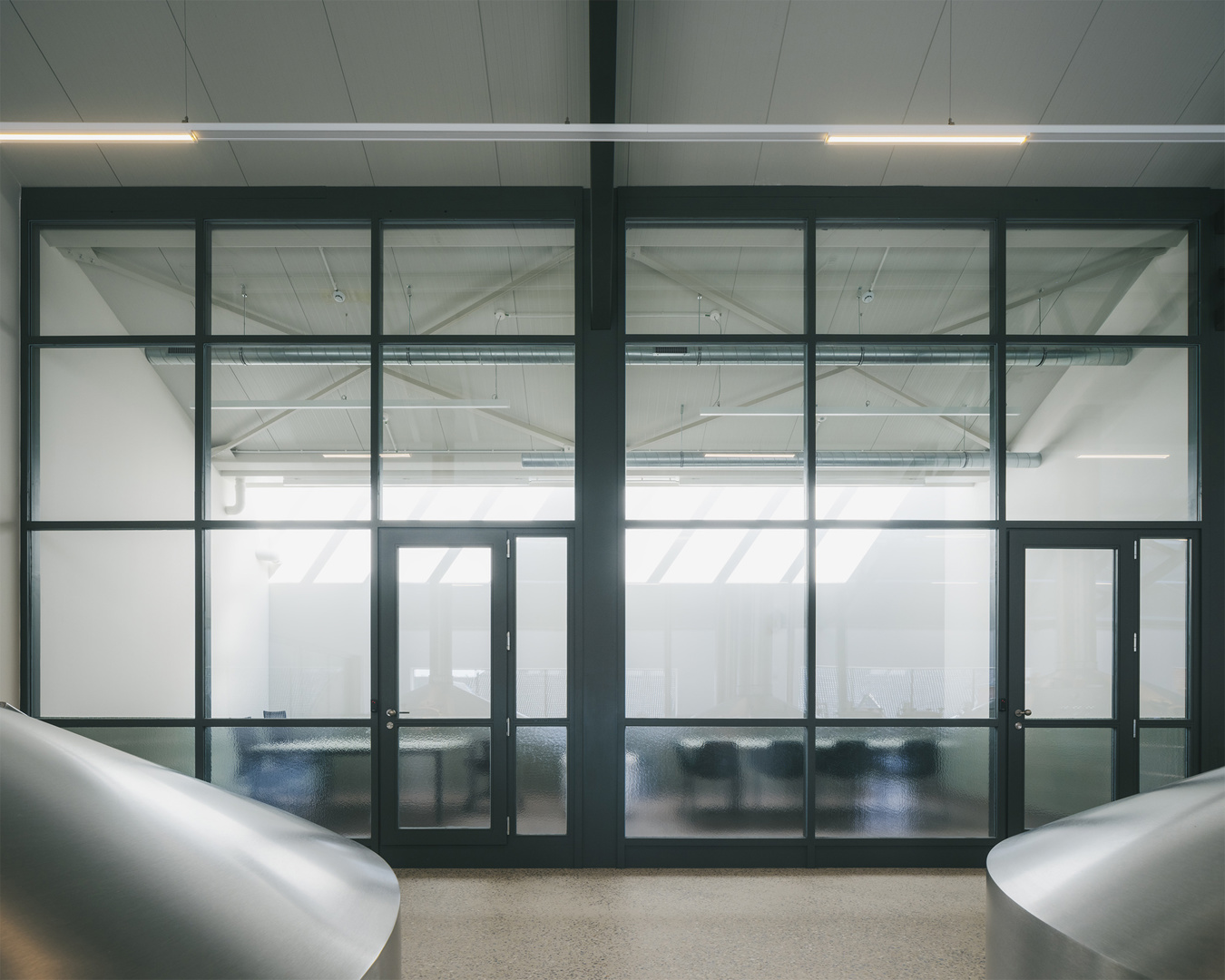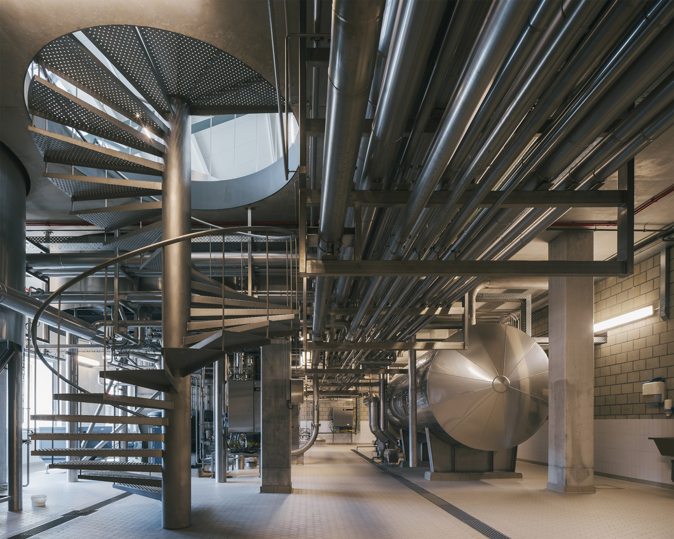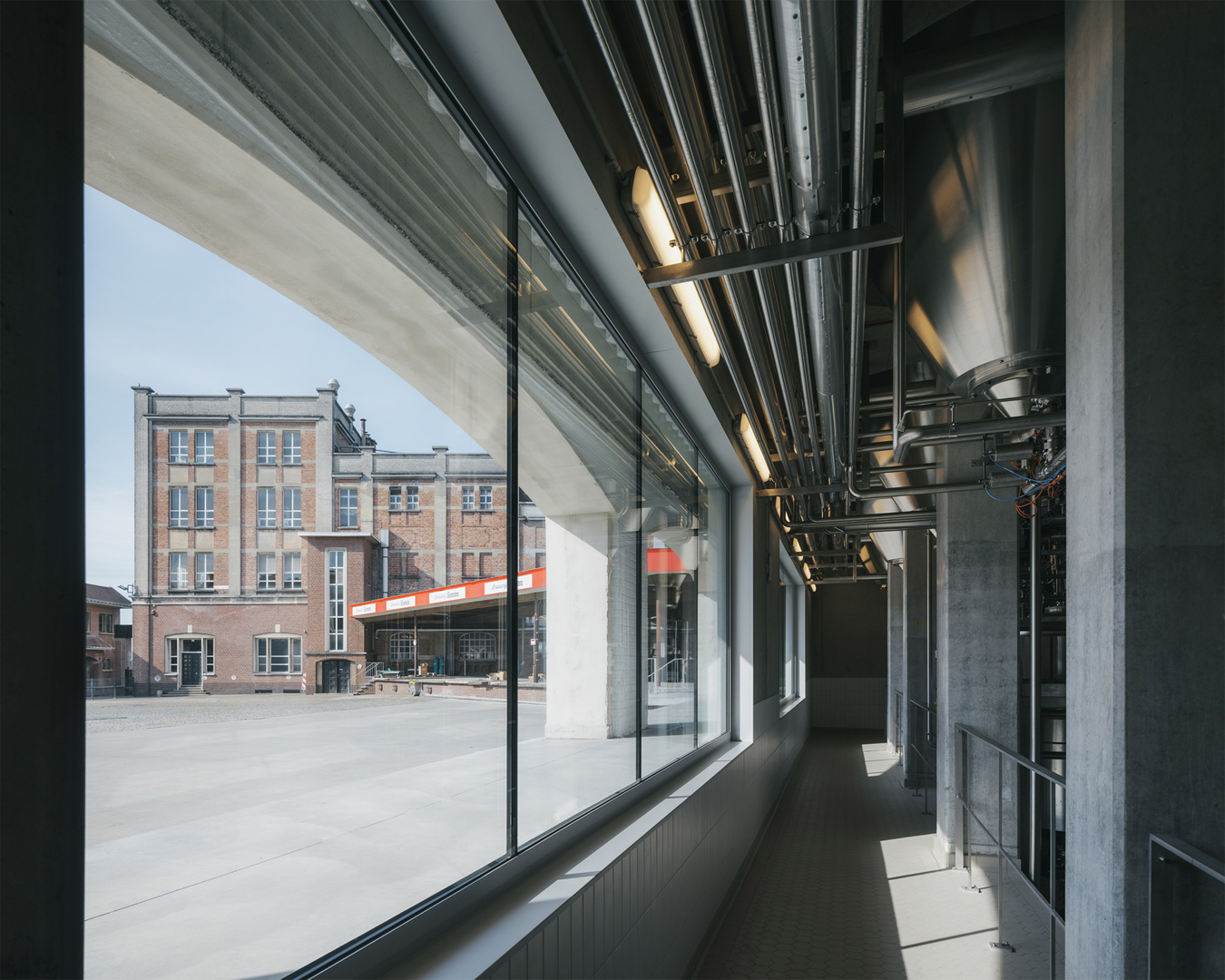 Binnenin vertrekt het ontwerp van de oorspronkelijke doorsnede. Op een robuuste betonnen tafelstructuur staan de brouwketels en gisttanks opgesteld, terwijl het gelijkvloers plaats biedt aan technische installaties. Een nieuwe staalstructuur ondersteunt het dak, waarin royale daklichten overvloedig daglicht binnenbrengen. Bovendien krijgt de bezoeker een zorgvuldig ontworpen parcours: vanaf de koer loopt een lus die via de overdekte loskade langs de brouwzaal en gisttanks naar een uitkijkplatform boven de bottelarij leidt. Zo ontstaat een traject dat productie, geschiedenis en gebouwde context op een vanzelfsprekende manier verbindt.