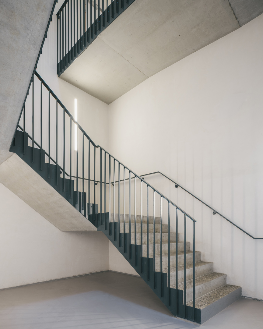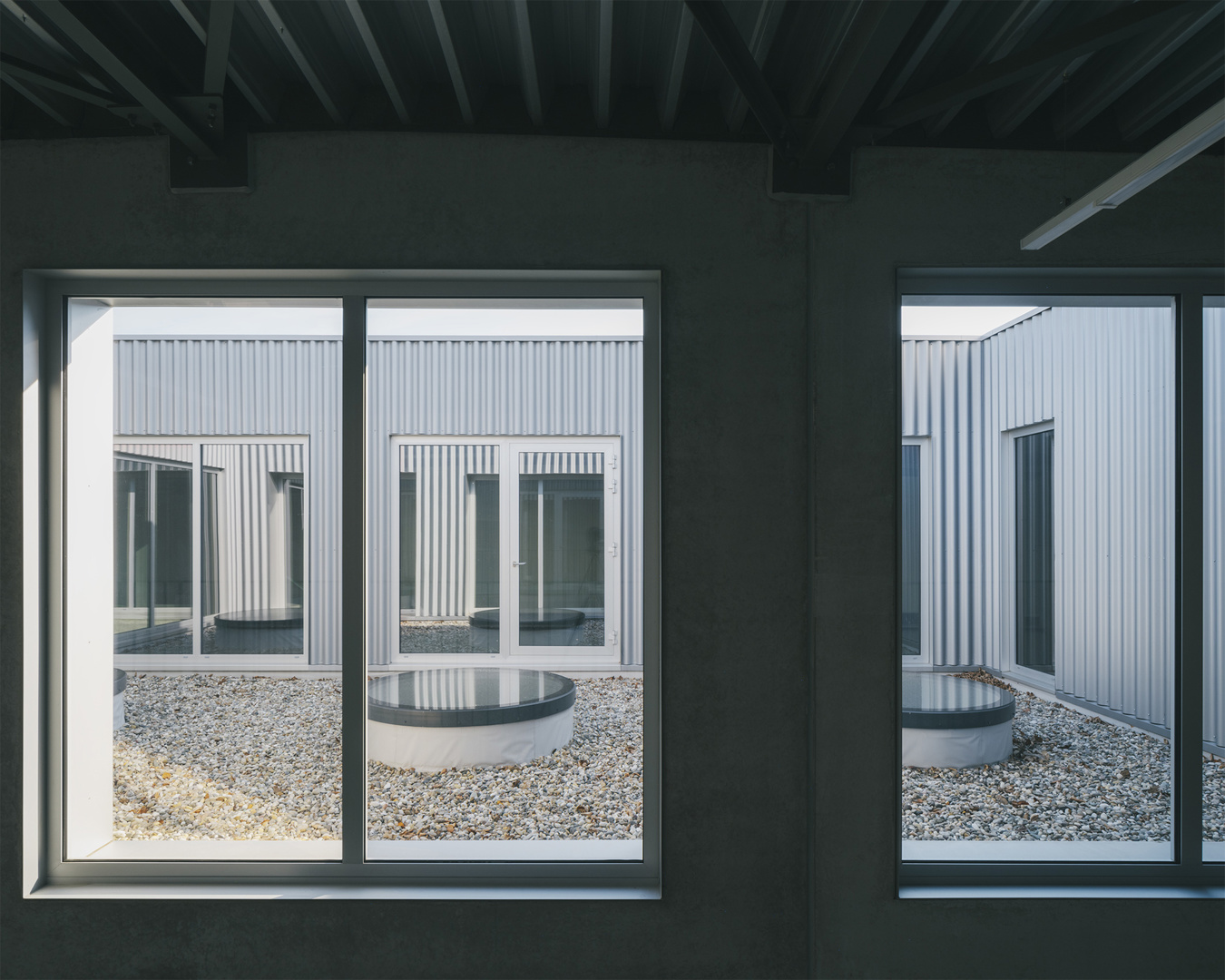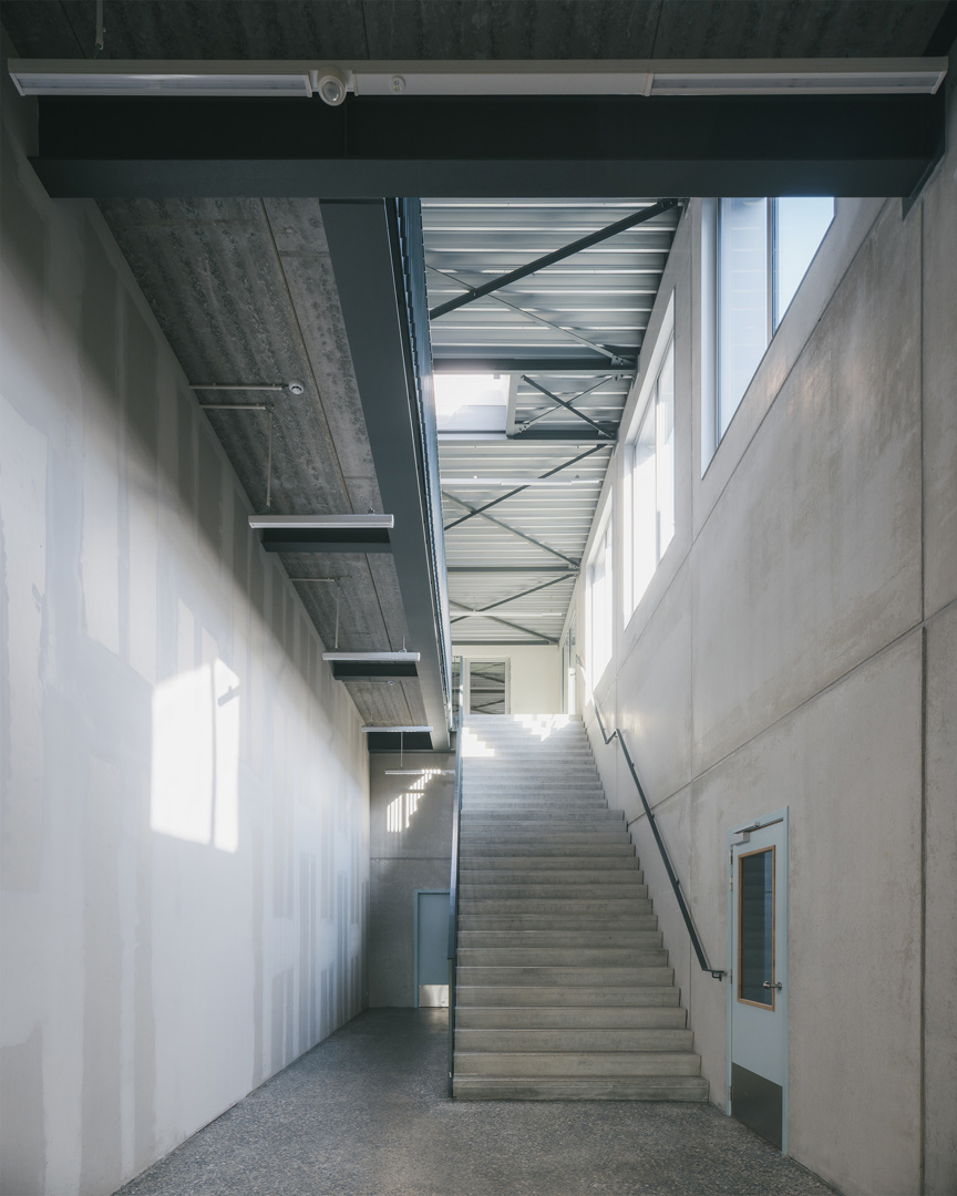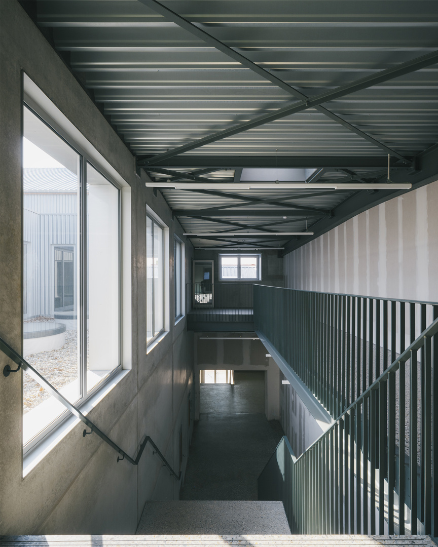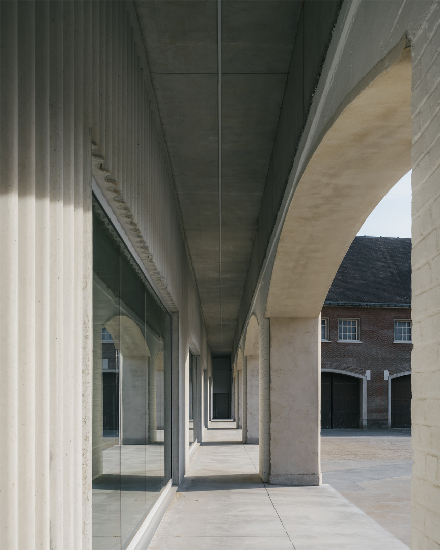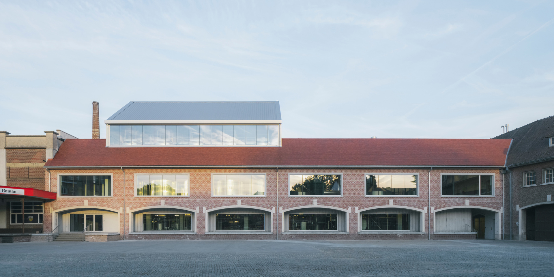 Ook in de gevelaanpassingen primeert respect voor het bestaande karakter. Vergrote raamopeningen zijn voorzien van betonnen lijsten die het ritme van de oude gevel herinterpreteren zonder die te camoufleren. Op de verdieping zorgen extra ramen voor een sterkere visuele relatie tussen interieur en koer. De vernieuwde poort, geflankeerd door een dubbele stalen ligger, fungeert tegelijk als functionele toegang en symbolische markering van een nieuwe fase in het verhaal van Brouwerij Roman—een nuchter gebaar met grote impact.