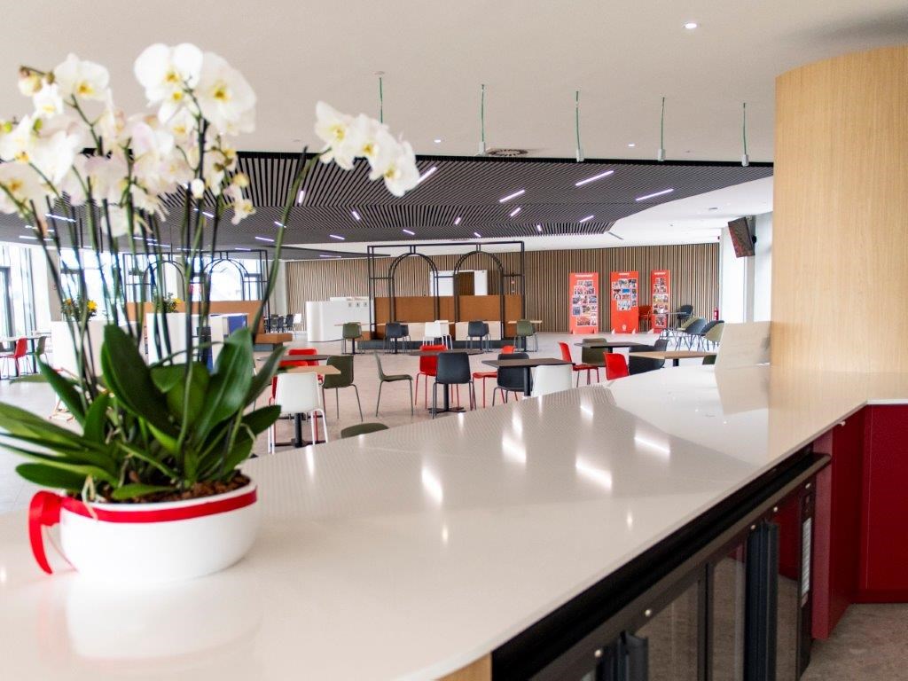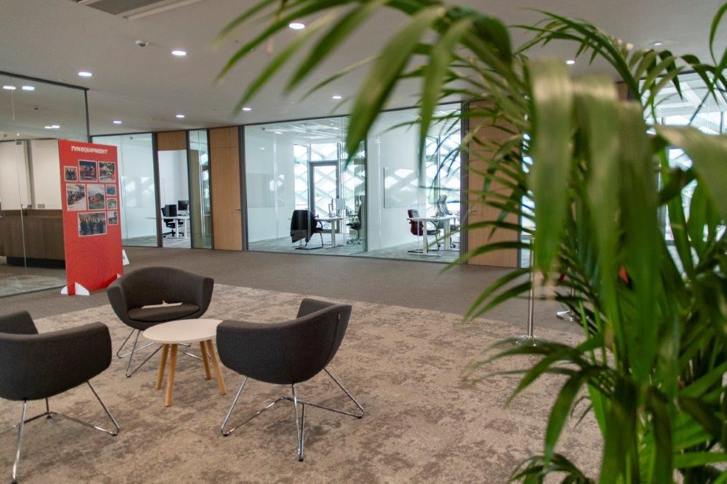 Net als de gevel – een fraai samenspel van geprefabriceerde zichtbetonpanelen, glas en het zonwerende raster op het verdiepingsniveau – dient het interieur zich aan als een gulden middenweg tussen high-end en industrieel. “Naast enkele betonaccenten is de binnenafwerking geënt op een drietal dominante tinten: het karakteristieke rood van TVH Equipment, neutraal wit en gebronzeerd meubilair”, vertelt Koen Gutschoven, projectleider bij Holvoet Gebroeders, dat fungeerde als hoofdaannemer voor de totaalafwerking. “Van de chape en isolatie tot en met de laatste penseelstreek van de schilder, en uiteraard alles daartussen (plafonds, gipskartonwanden, glazen wanden, vloeren, vast meubilair …): we hebben het allemaal in goede banen geleid. Een brede waaier aan meubilair met atypische vormen, gebronzeerde lakafwerking, specifieke metaalwerken en diverse eiken accenten zijn de eyecatchers van dienst. De meubels bevinden zich op prominente plaatsen in het gebouw en springen dus sterk in het oog. De inkombalie zet al meteen de toon. Het resultaat is zeer geslaagd, we hebben al veel lovende reacties gekregen.”
