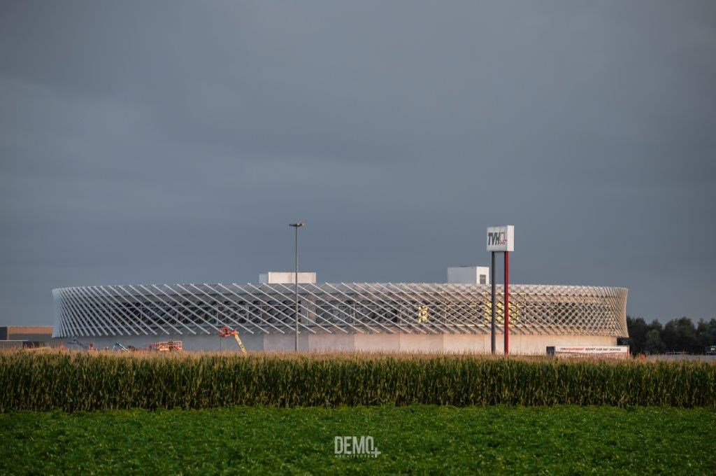 Het indrukwekkende ontwerp is van de hand van DEMO Architecten, dat een compact volume met een opvallende ringvorm ontwierp. Al heeft dat zeker niet alleen met esthetische overwegingen te maken, benadrukken architect-bestuurders Levi Deryckere en Dirk Moerman. “Het bouwprogramma is behoorlijk functioneel, net als de vorm van het gebouw. Voor het herstel en onderhoud van grote, hoge machines waren er maar liefst veertig werkplaatsen met nodig, uitgerust met riant beglaasde sectionaalpoorten. Ze zijn ingericht op het gelijkvloers en strategisch gegroepeerd rond een centrale kern met het magazijn, het sanitair en de kleedkamers om onnodig lange loopafstanden te voorkomen en de logistieke organisatie op het 52.000 m² grote terrein te bevorderen, waarbij het gebouw fungeert als rotonde voor de af en aan rijdende voertuigen en machines. De keuze voor een rond geheel met een diameter van ruim 90 meter vloeide dus vooral voort uit praktische overwegingen. Dit concept resulteerde in een compact gebouw dat het leven van de techniekers aangenamer maakt en een betere kennisoverdracht en maximaal visueel contact op de werkvloer garandeert. Ook de rolbruggen zijn afgestemd op de ronde vorm.”