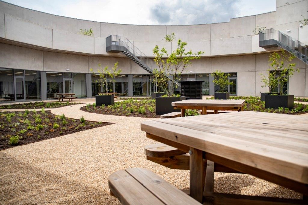 Daarnaast moesten de architecten ook ruimte voorzien voor de benodigde ondersteunende functies (zoals een polyvalente refter) en de bureaus van de administratieve medewerkers en de ICT-afdeling. Deze zijn ondergebracht op de bovenliggende kantoorverdieping, met aan de ene zijde zicht op de werkplaatsen en aan de andere zijde een gezellige binnentuin met groenaccenten en zitmeubilair. “Deze laatste is bereikbaar via verschillende buitentrappen en vormt samen met de omliggende terrassen een oase van rust in de industriële omgeving”, leggen Levi Deryckere en Dirk Moerman uit. “De buitengevel van de riant beglaasde kantoorverdieping is dan weer uitgerust met structurele zonwering in de vorm van een dubbele laag aluminiumlamellen. Dit ruitvormige raster – met open mazen aan de noordzijde en densere mazen aan de oost-, zuid- en westkant – is als het ware de kroon op het werk. Het draagt bij aan de iconische status van het gebouw, dat een nieuw landmark in de omgeving is. Ook op energetisch vlak gooit het complex overigens hoge ogen dankzij onder meer geothermische verwarming en koeling via een BEO-veld.”
