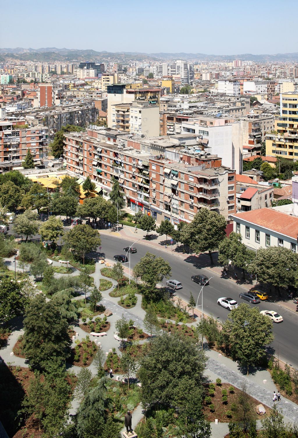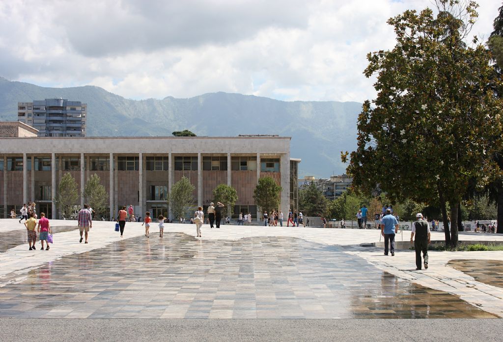 Het centrale plein van Tirana is ontworpen als een leegte midden in de chaos van de stad, een leegte gevormd door een verzameling van tuinen en publieke gebouwen, zoals bestaand als nieuw. De omringende groene gordel fungeert als een soort van voorkamer tussen de dichtheid van de stad en de leegte van het plein.