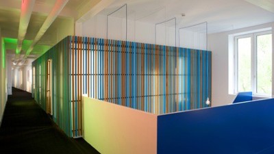 Een soortgelijke ingreep werd toegepast bij de vergaderzalen, dewelke zich op elke verdieping bevinden achter een glaswand die daglicht toelaat tot in de gang. Door de glaswand terugliggend te plaatsen en zowel de wand- als de vloerbekleding van de gang door te trekken in de vergaderruimte ontstaat er een visuele verbreding van de smalle gang. Sterker nog, de ruimte wordt niet langer ervaren als een lange, smalle gang met deuren, maar als een groot plateau waarop opeenvolgende volumes staan, als ware het kleurrijke containers. Deze visuele volumetrie creëert een gevoel van ruimte en zorgt voor herkenbaarheid.