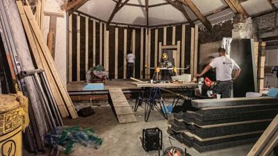 Het plan wordt georganiseerd rondom een centrale toog en de 'abdijtafel' die een belangrijke rol speelt binnen het teamgegeven van het bedrijf. Meeting rooms, landschapskantoor, boardroom en individuele kantoren worden gerangschikt rondom deze centrale plek. De plan organisatie maakt het mogelijk dat er doorzichten zijn in heel het kantoor en er een zeer ruimtelijk gevoel ontstaat.