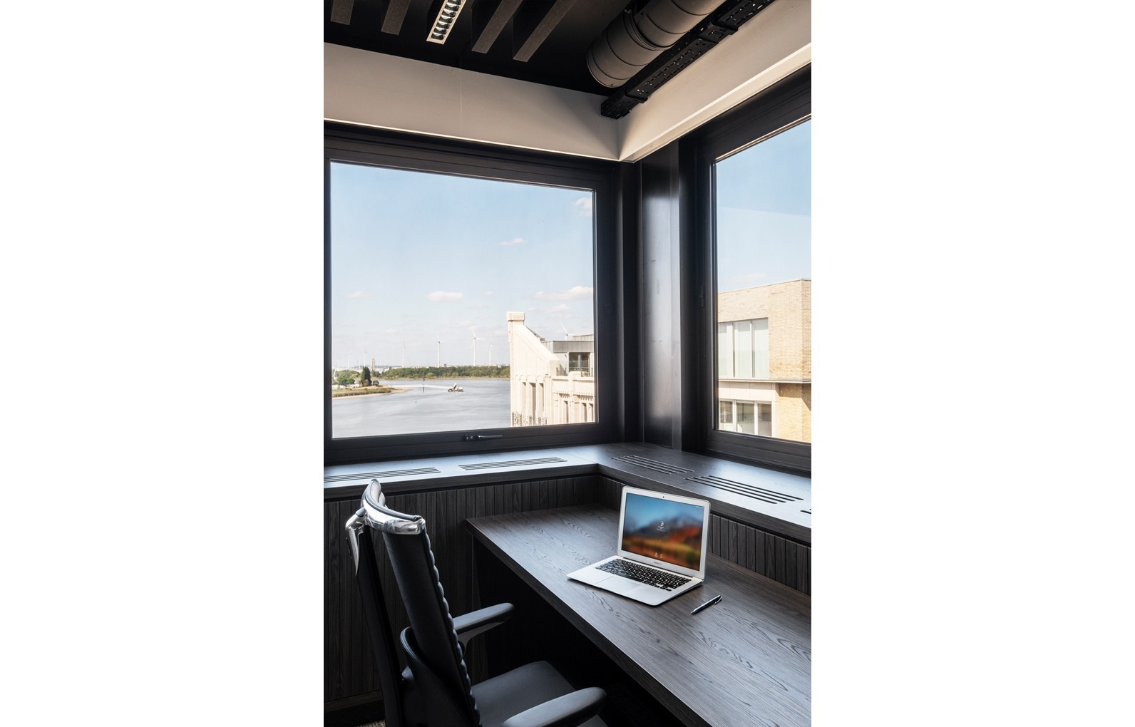 De materialisatie van het interieur is gedeeltelijk geïnspireerd op de vroegere inrichting dat de bouwheer zeer aansprak. De claustra wanden zijn gerecupereerde elementen, evenals de meeste deuren. Het gebruik van hout refereert naar de kisten op de loskade. Het kantoorgebouw staat immers op de vroegere Sint Pieters vliet. De donkere kleuren geven het loftkantoor een stijlvolle uitstraling het blauw is een verwijzing naar het bedrijfslogo.