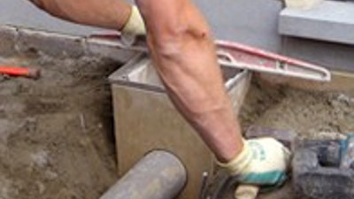 De Gallo-afvoerput kan makkelijk vastgezet worden in de stabilisé die dienst doet als ondergrond voor de bovenliggende stenen. Indien de funderingsplaat verhindert dat de Gallo niet op volledige hoogte ingebouwd kan worden (de bovenkant moet immers net onder de waterkeringslijn van de woning liggen om opstijgend vocht in de muren te voorkomen), kan hij makkelijk ingekort worden met behulp van een slijpschijf. Deze ingreep beperkt het opvangvolume echter niet. Belangrijk is wel dat de inox rooster nog past op het bijgeslepen lichaam. De afvoerput wordt aangesloten op de ondergrondse rioleringsbuizen via een kunststof buis van 110 mm diameter.