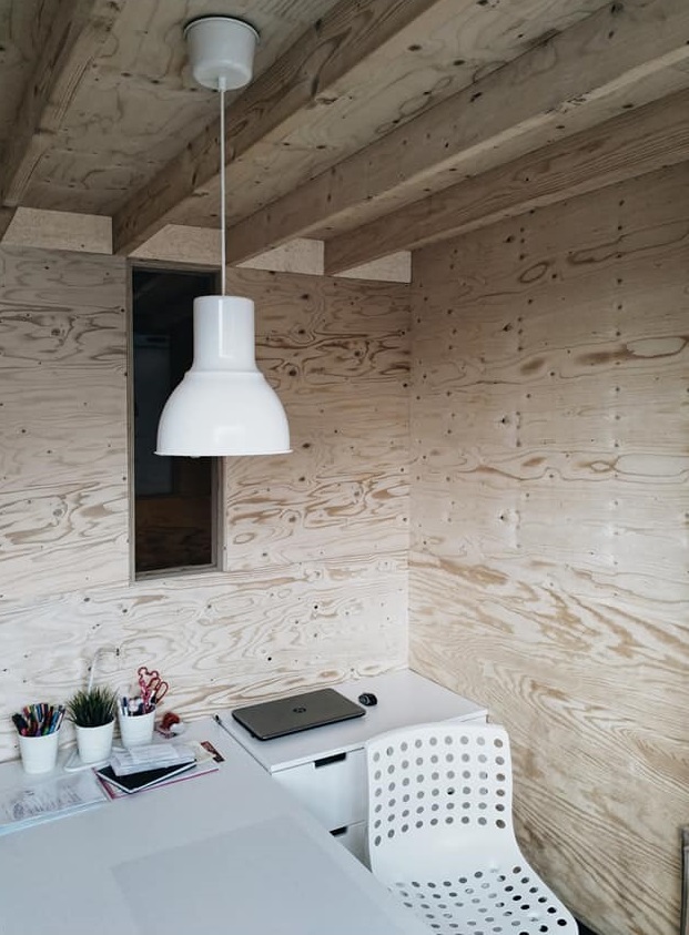 “Er komen verschillende elementen bij kijken. Je hebt het ontwerp, de materiaalkeuze, de opbouw. Over alles moet nagedacht worden vanaf het eerste moment. De circulaire praktijk was een tijdelijke oplossing, want er waren wel al plannen om de huidige praktijk grondig te renoveren. Er moest dus al nagedacht worden over de volgende bestemming van de materialen van de tijdelijke praktijk. Zo hebben we standaardmaten gebruikt voor de tussenafstanden tussen stijlen en wanden. Op die manier kunnen er al veel elementen hergebruikt worden. Ook qua materialen werd er gekozen voor elementen die men in nagenoeg elk project kan gebruiken en hergebruiken. Ik heb ervoor gekozen om ze zo weinig mogelijk te verzagen. De multiplexplaten hadden een standaard afmeting die niet werd aangepast zodat ze later makkelijk hergebruikt zouden kunnen worden. Dat geeft ook bijzondere esthetische effecten. Door ervoor te kiezen om niet te zagen, overlappen sommige platen elkaar met enkele centimeters, in plaats van dat ze precies op elkaar aansluiten. Dat geeft een speels element in het plan. Voor de enkele platen die wel verzaagd moesten worden, maakten we een zaagplan zodat we zo efficiënt mogelijk het hout konden gebruiken. Uiteindelijk was er bijna geen restafval.”