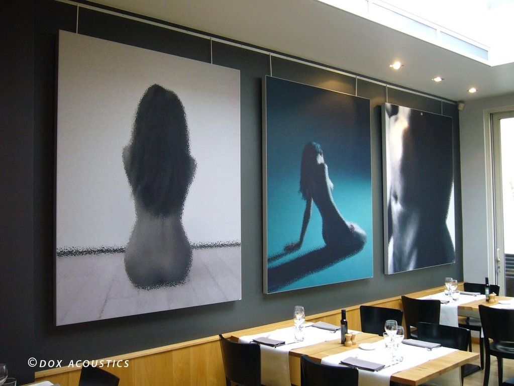 Dit akoestisch weefsel met een gepersonaliseerde opdruk naar keuze wordt gemonteerd op een fijn aluminium frame. De holle ruimte wordt gevuld met geluidabsorberende panelen.