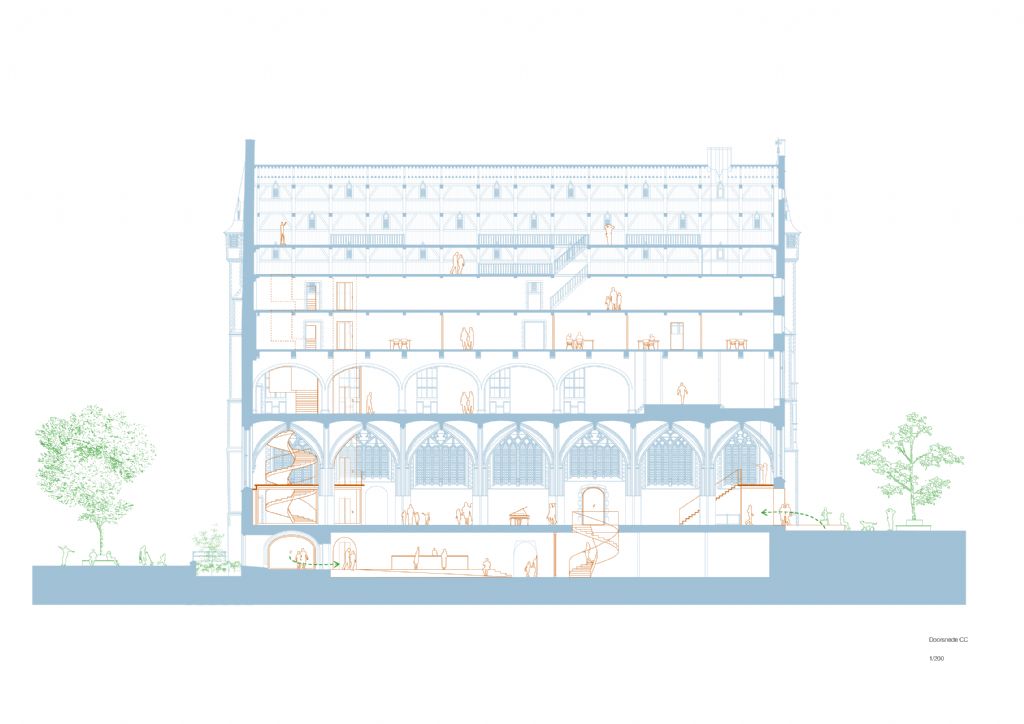 In het voorontwerp wordt de eigenheid van deze verschillende ruimtes en niveaus versterkt en met elkaar verbonden.