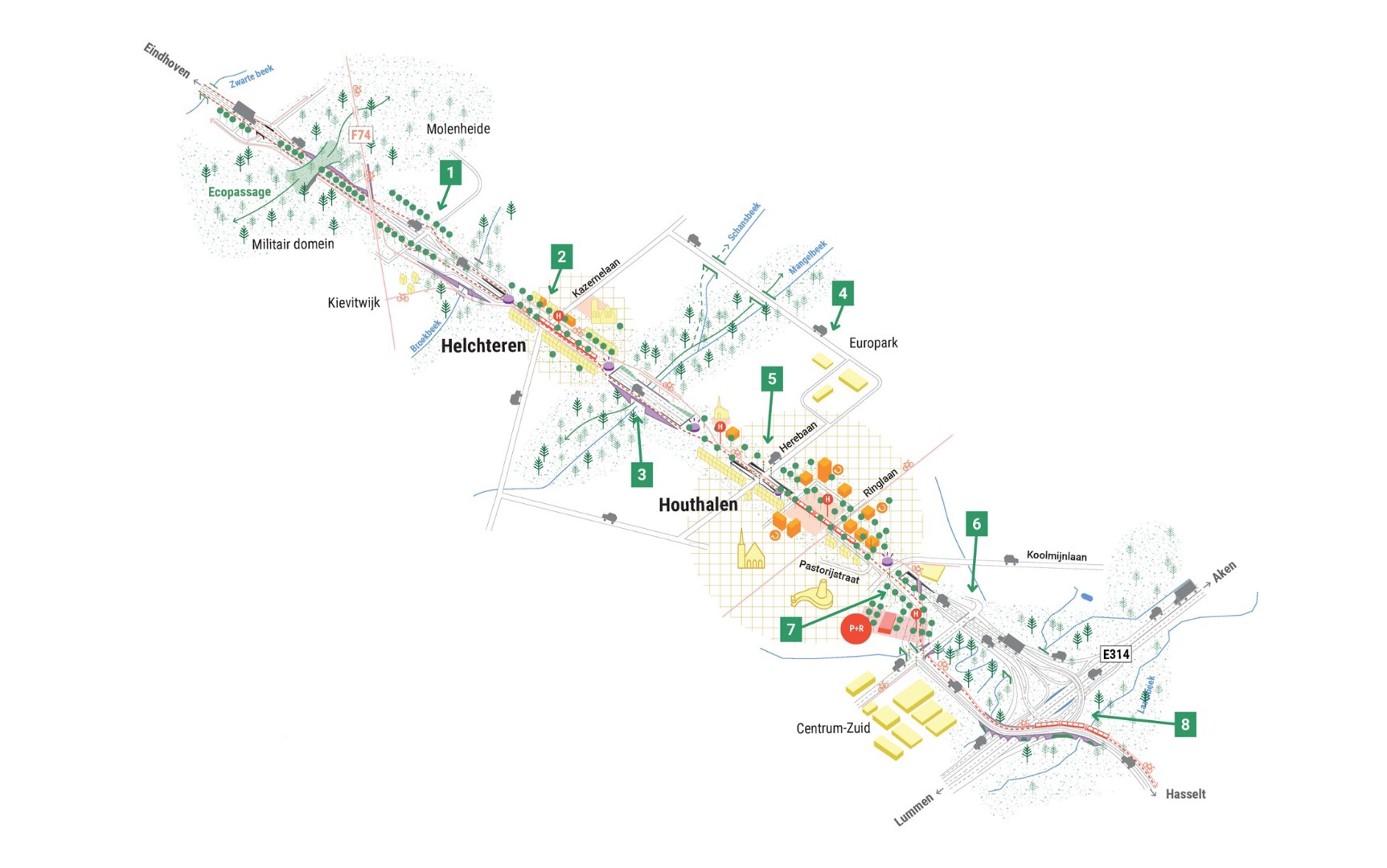 Zo komt er een ecoduct in het noorden van Helchteren, waardoor natuurgebieden opnieuw met elkaar verbonden worden. In de Broekbeekvallei wordt een ecotunnel voorzien voor onder meer reeën en amfibieën. De Mangelbeekvallei wordt heringericht als een natuurlijke waterloop, overspannen door bruggen voor verschillende vervoersmodi, terwijl fauna er vrij kan passeren. Ook bovenop de tunnels ontstaat ruimte voor groen: de centra van Houthalen en Helchteren krijgen een nieuwe, groene invulling met aandacht voor verblijfskwaliteit en biodiversiteit.