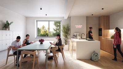Het programma omvat 88 kamers van 12 – 18 m² en 22 studio’s van 22 m² met eigen sanitair en kitchenette. Dankzij een slimme positieschakeling van natte cellen en prefab schachten houdt het ontwerp de renovatiekost binnen de perken en blijft elke unit flexibel voor toekomstig hergebruik.